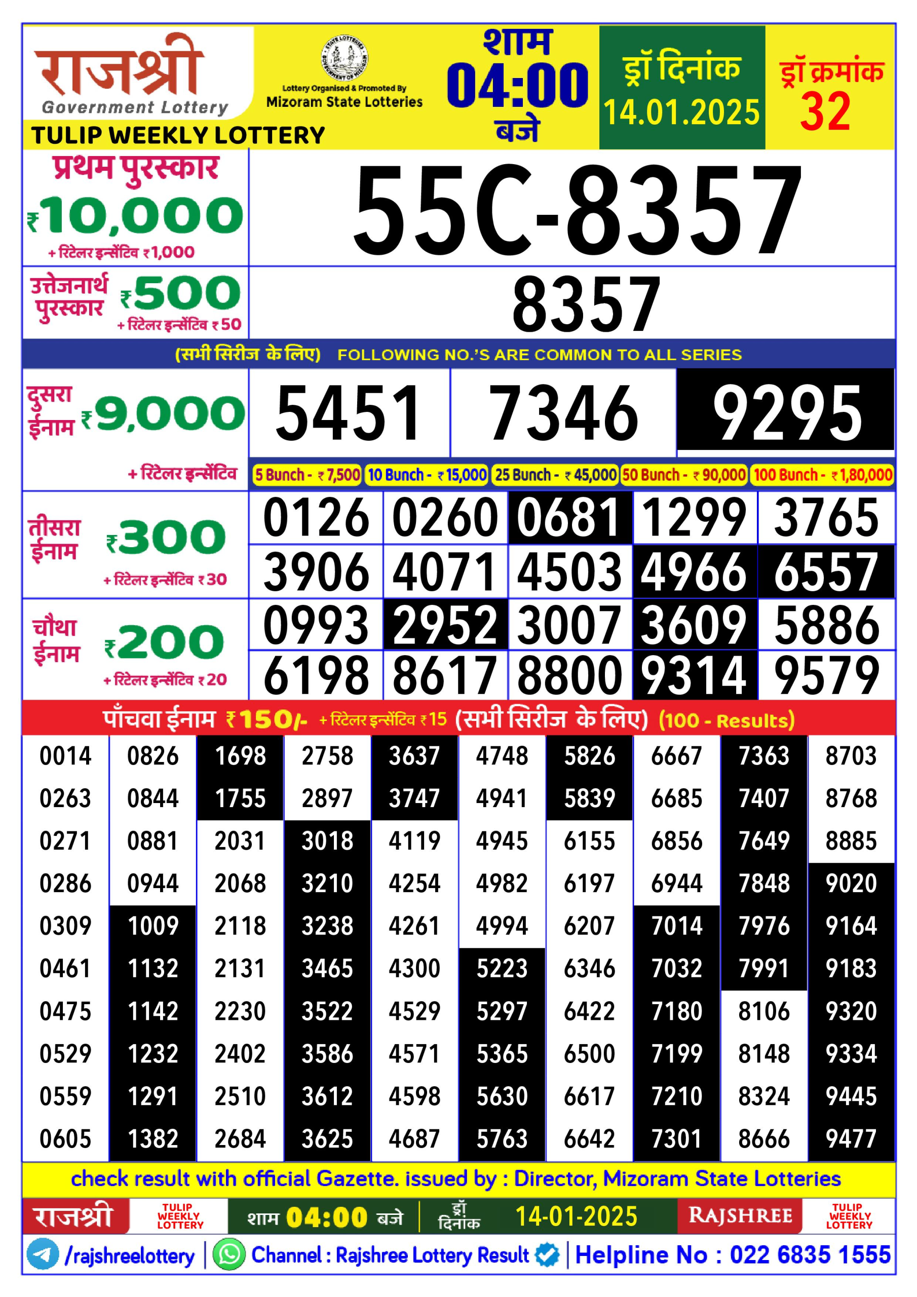 Rajshree tulip Tuesday Weekly Lottery 4PM Result 14.1.25