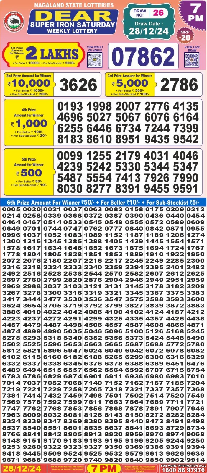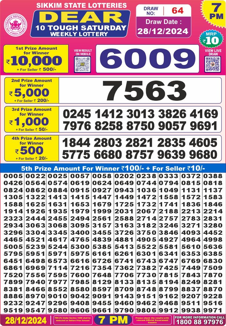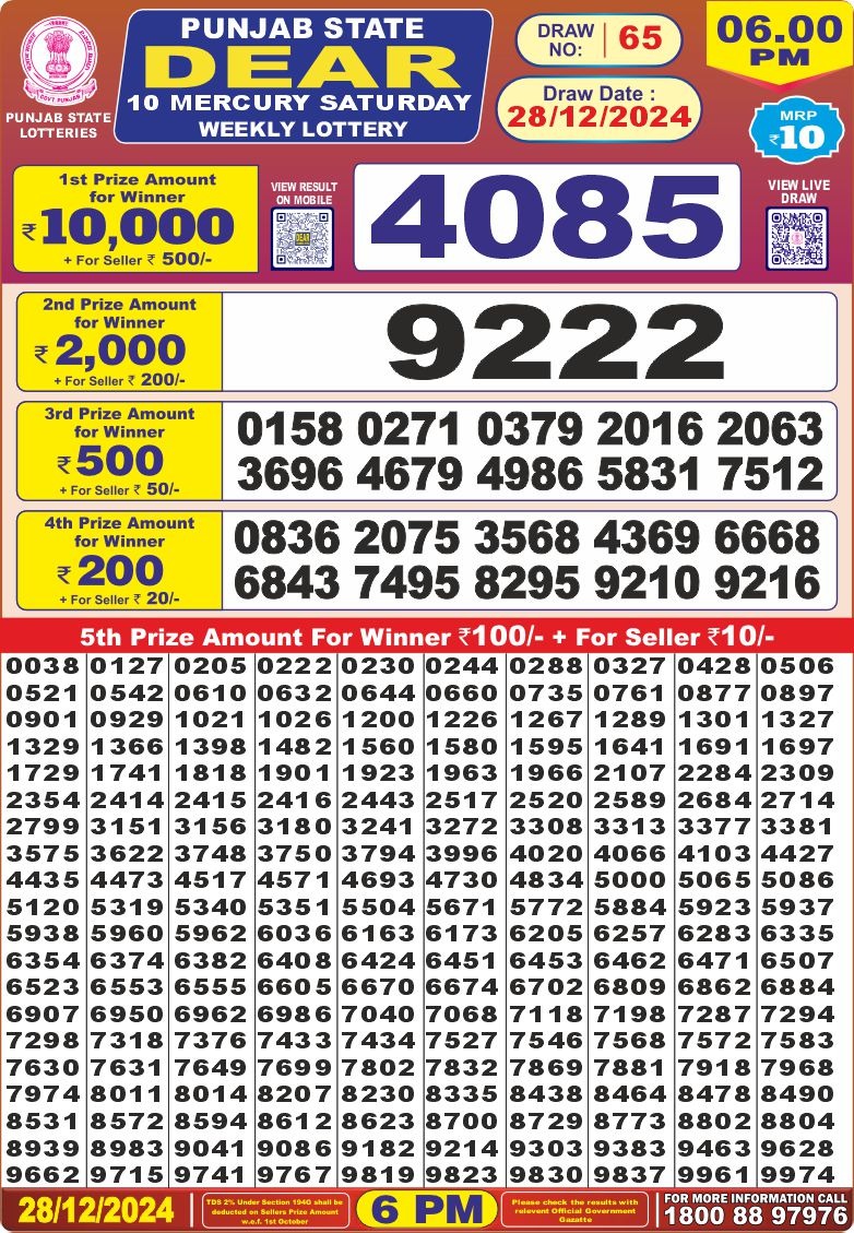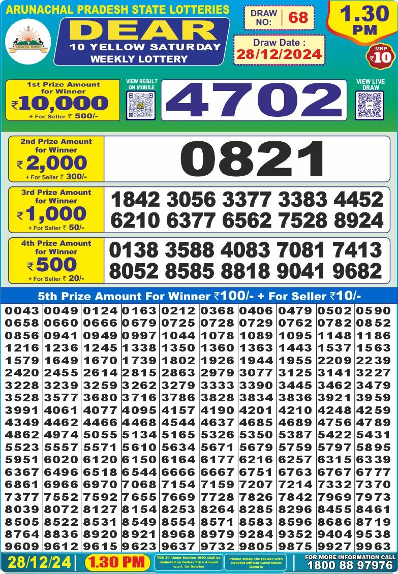 Dear 10 yellow lottery 1.30PM Result 28.12.24