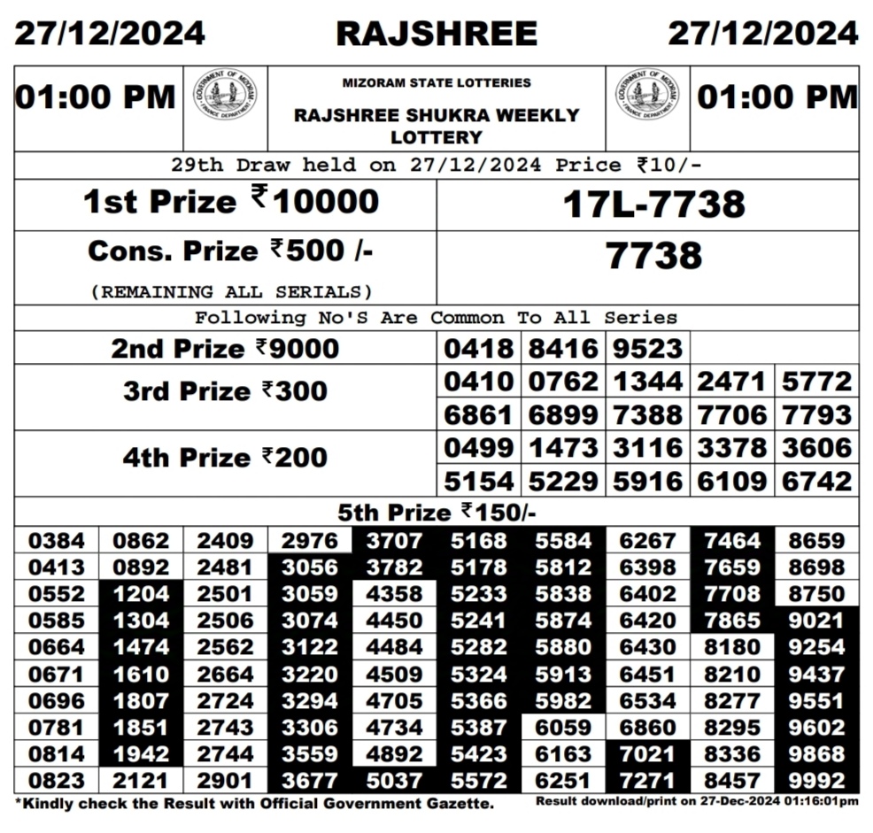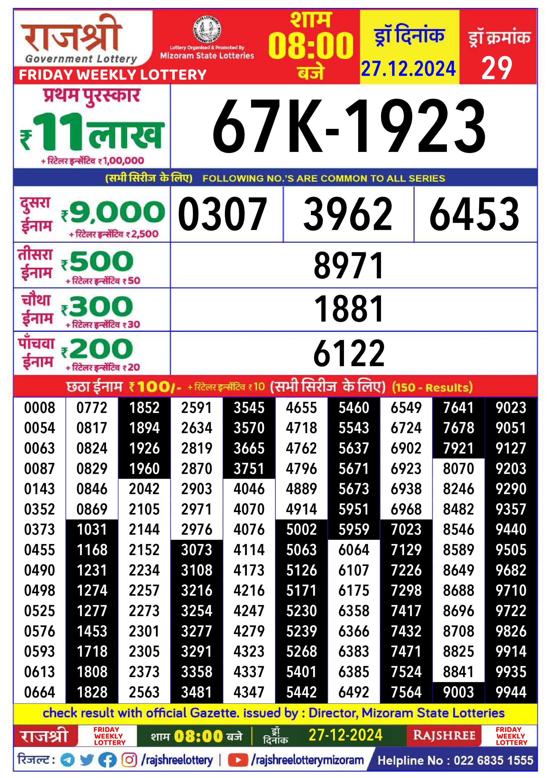 Rajshree Weekly Lottery 8PM Result 27.12.24