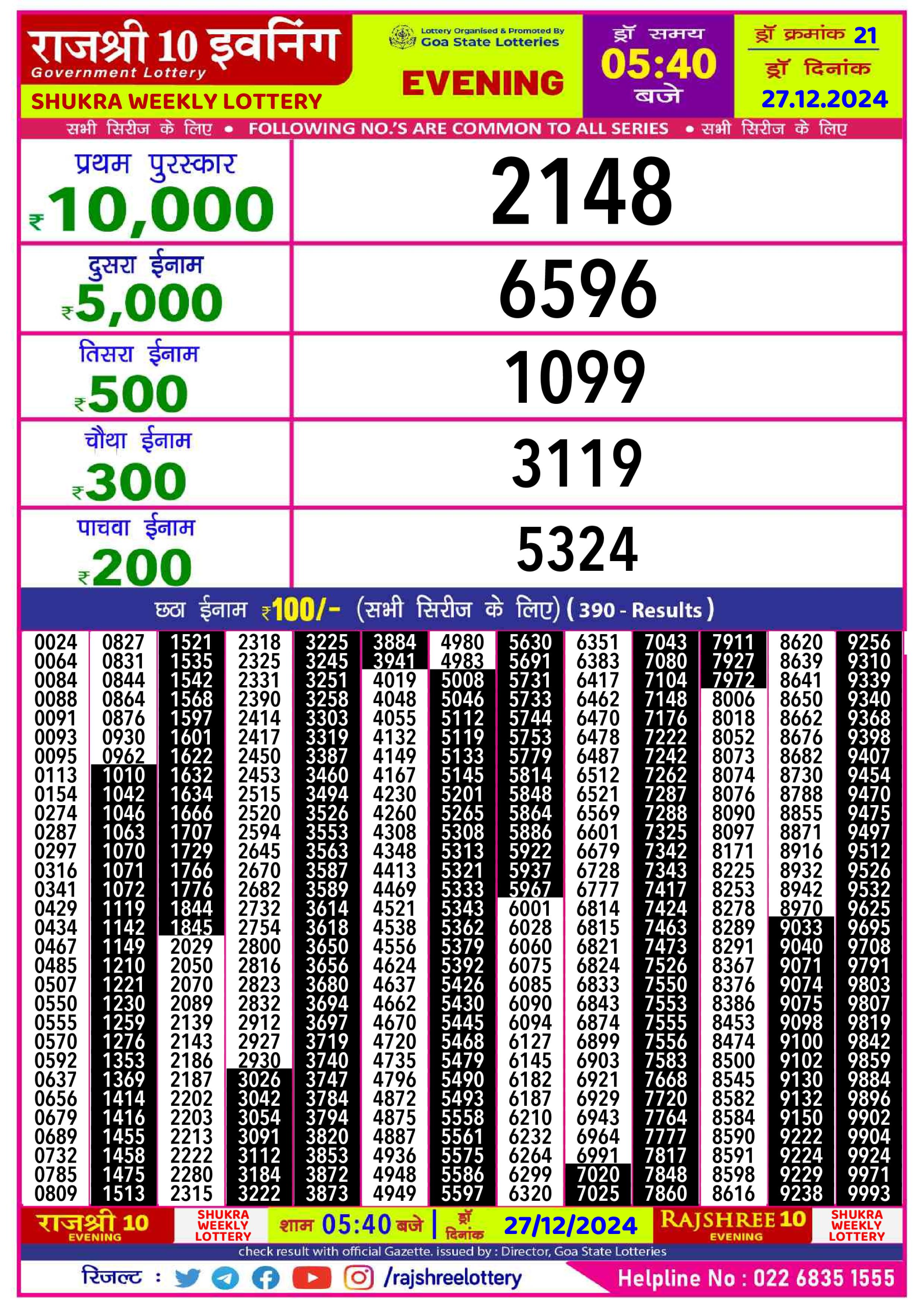 Rajshree 10 evening friday 5:40pm result 27.12.24