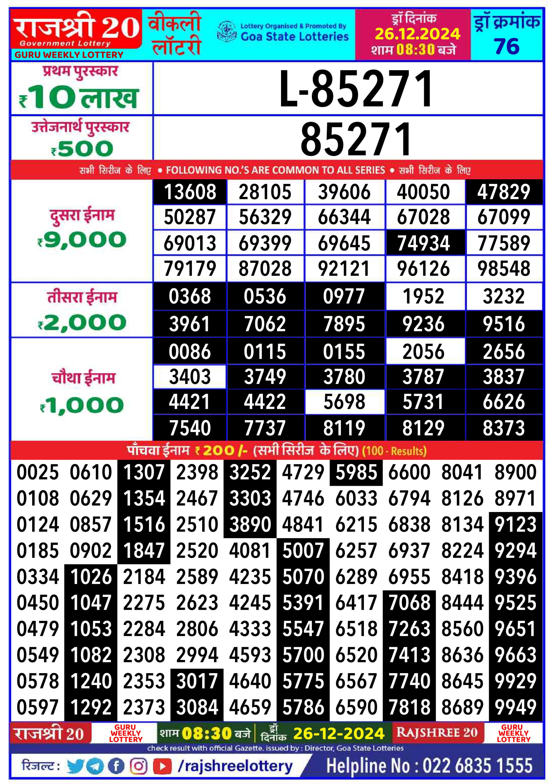 Rajshree 20 Lottery 8:30PM Result 26.12.24