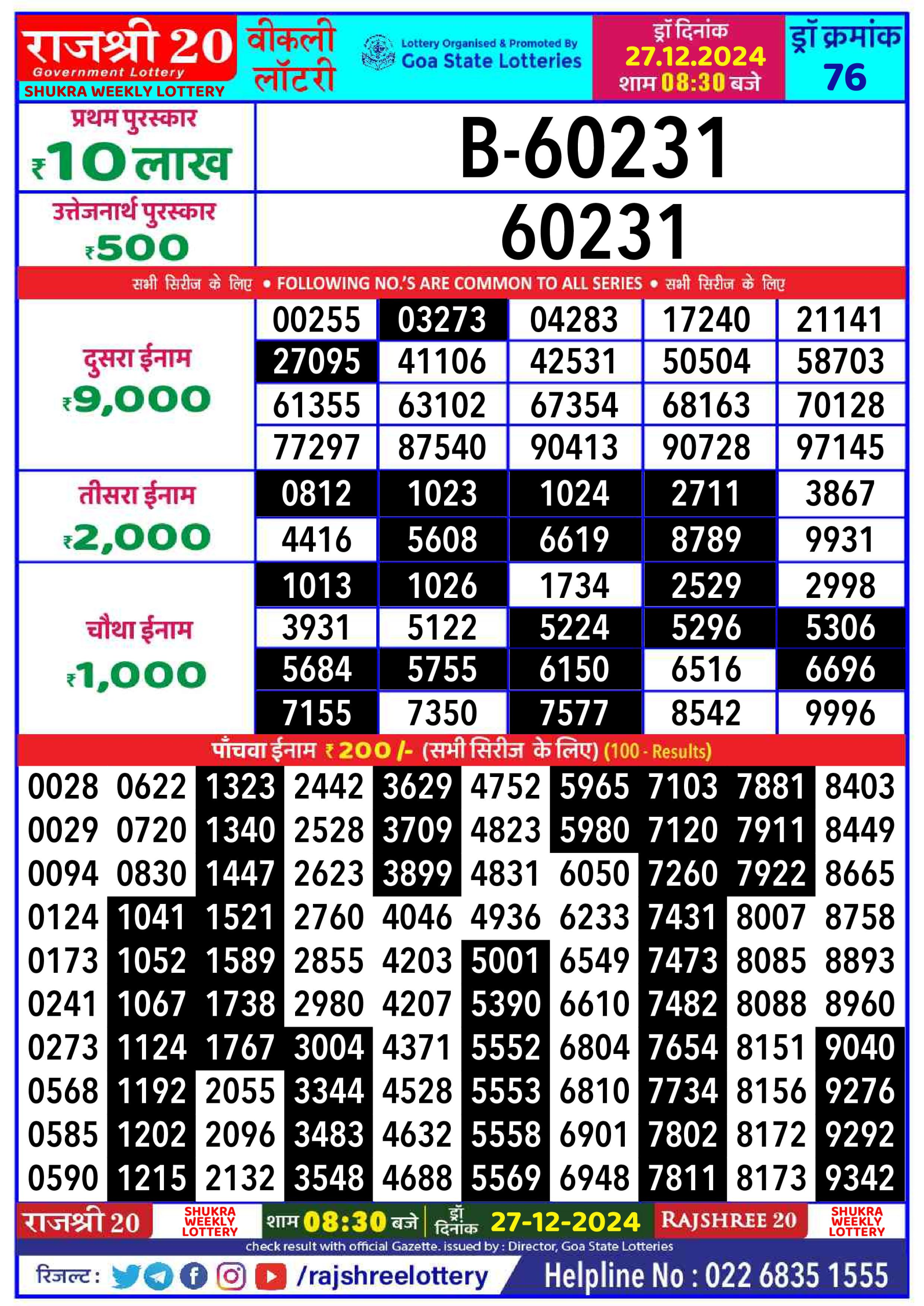 Rajshree shukra Weekly Lottery 1PM Result 27.12.24