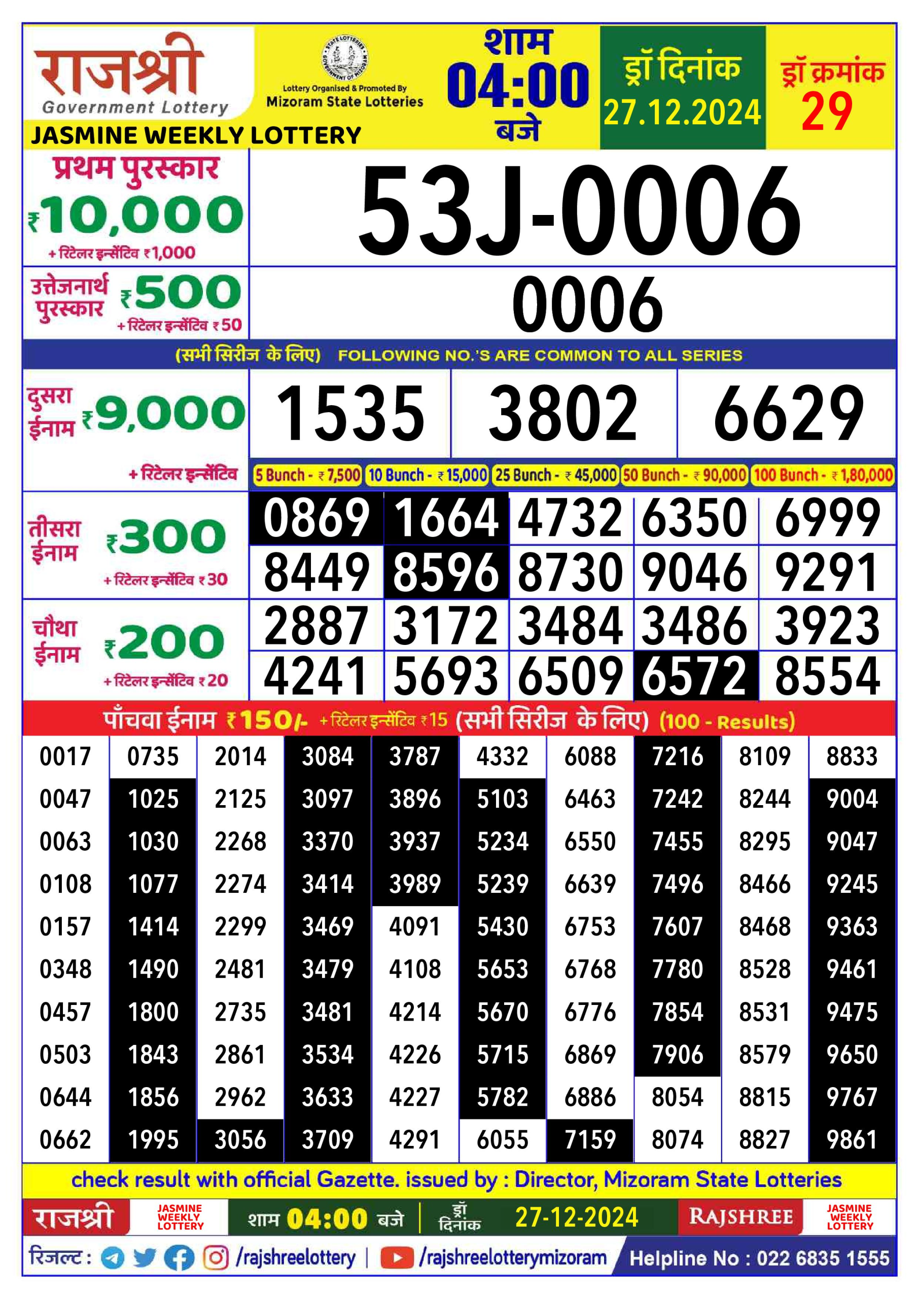 Rajshree jasmine tuesday Weekly Lottery 4PM Result 27.12.24