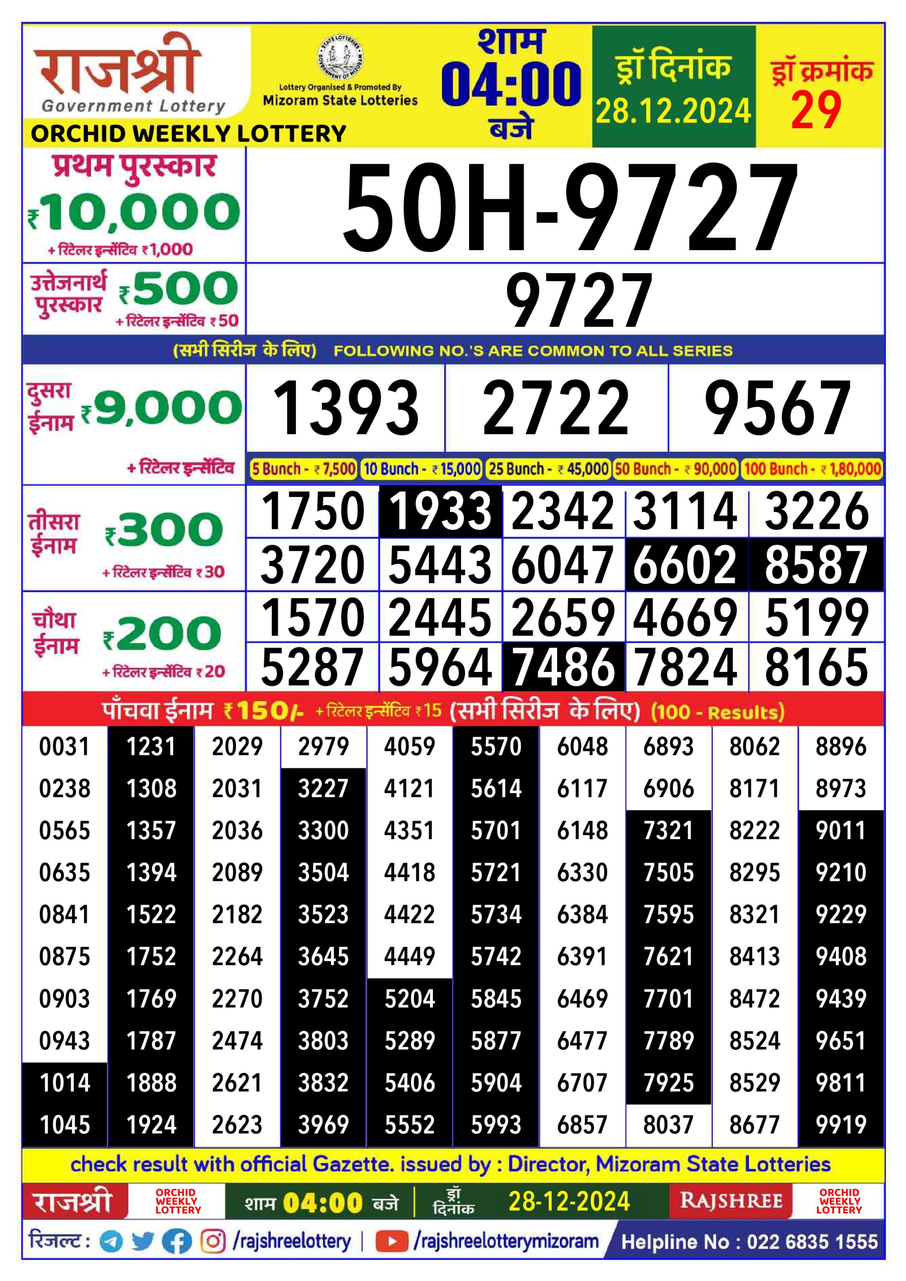 Rajshree orchid Saturday Weekly Lottery 4PM Result 28.12.24