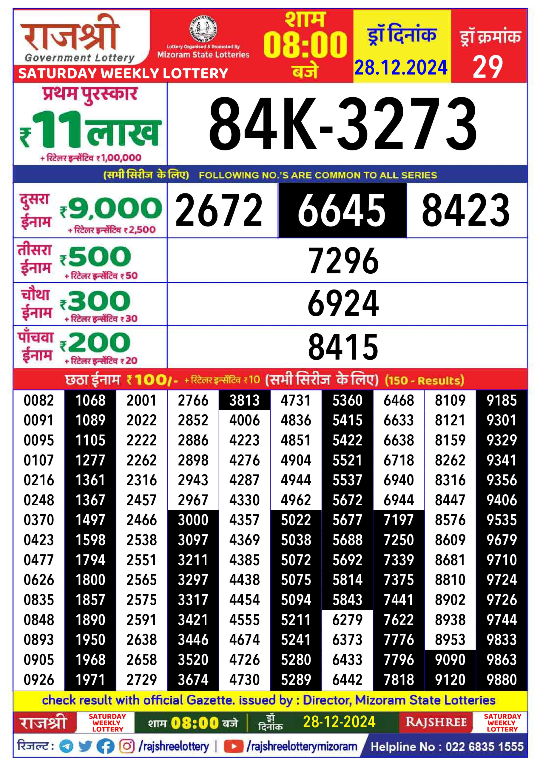 Rajshree Weekly Lottery 8PM Result 28.12.24