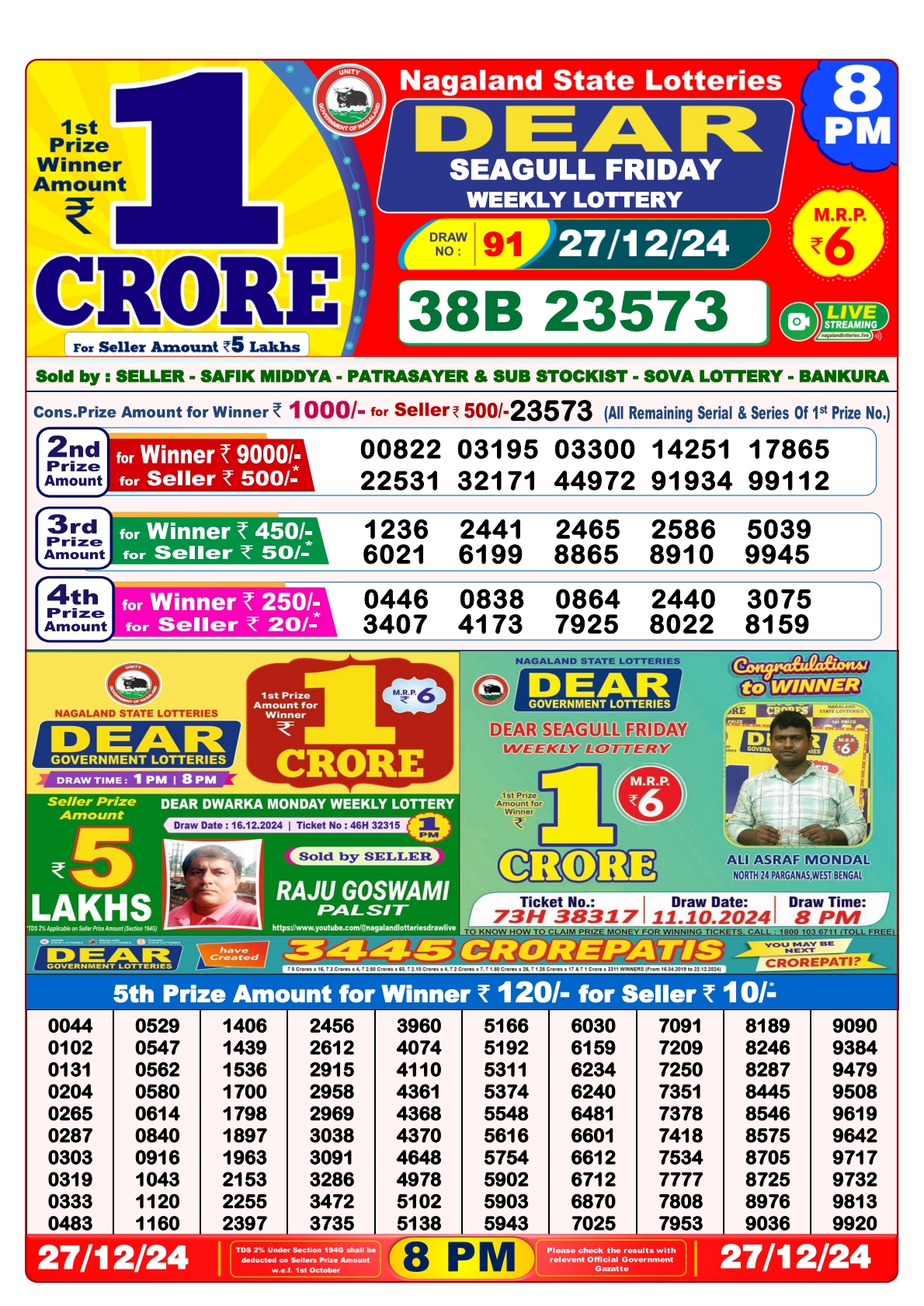 Dear seagull Weekly Lottery 8PM Result 27.12.24