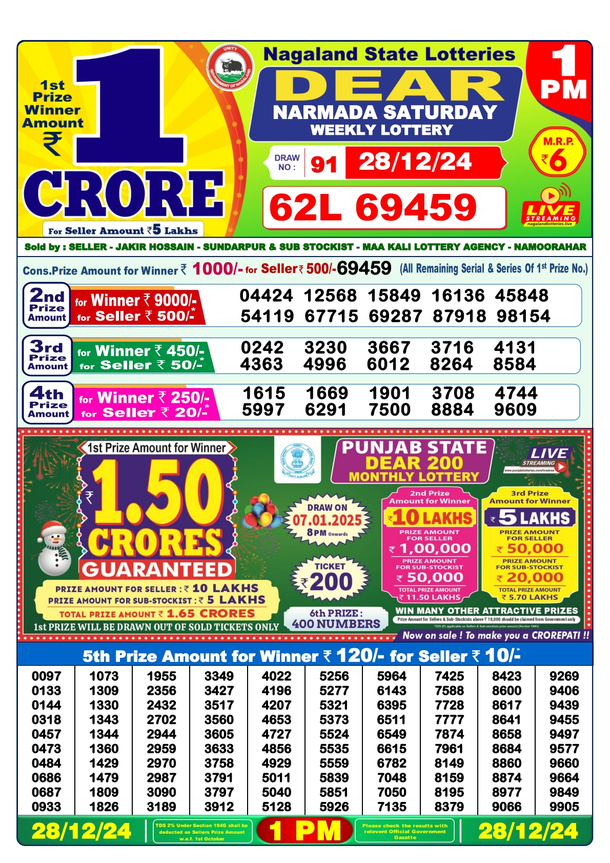 Dear narmada saturday Weekly 1pm result 28.12.24