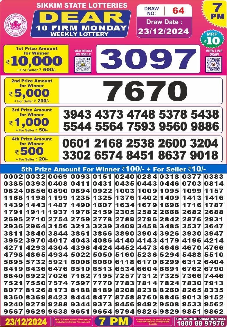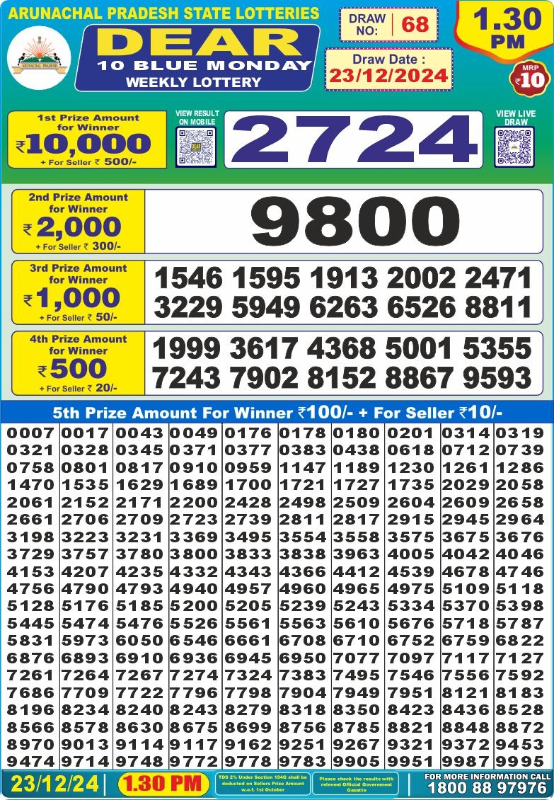 Dear 10 blue lottery 1.30PM Result 23.12.24