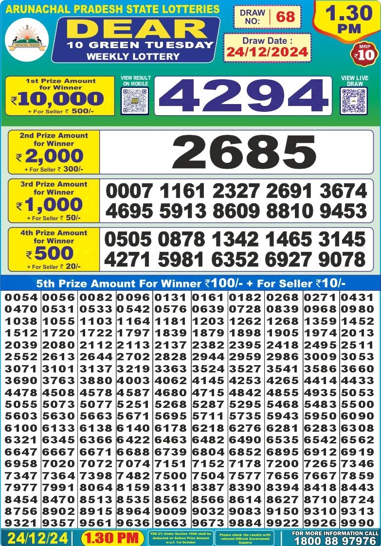 Dear 10 green lottery 1.30PM Result 24.12.24