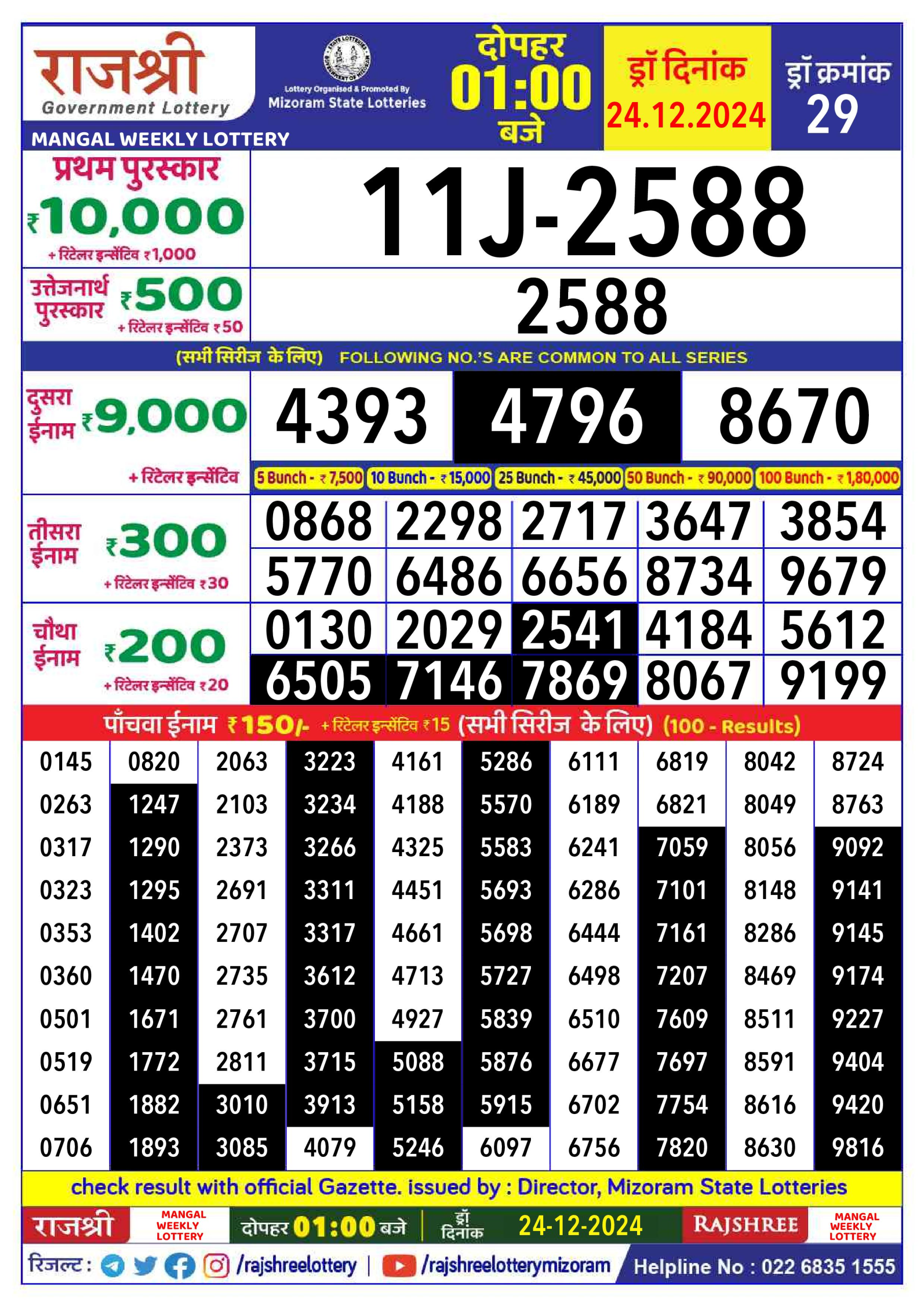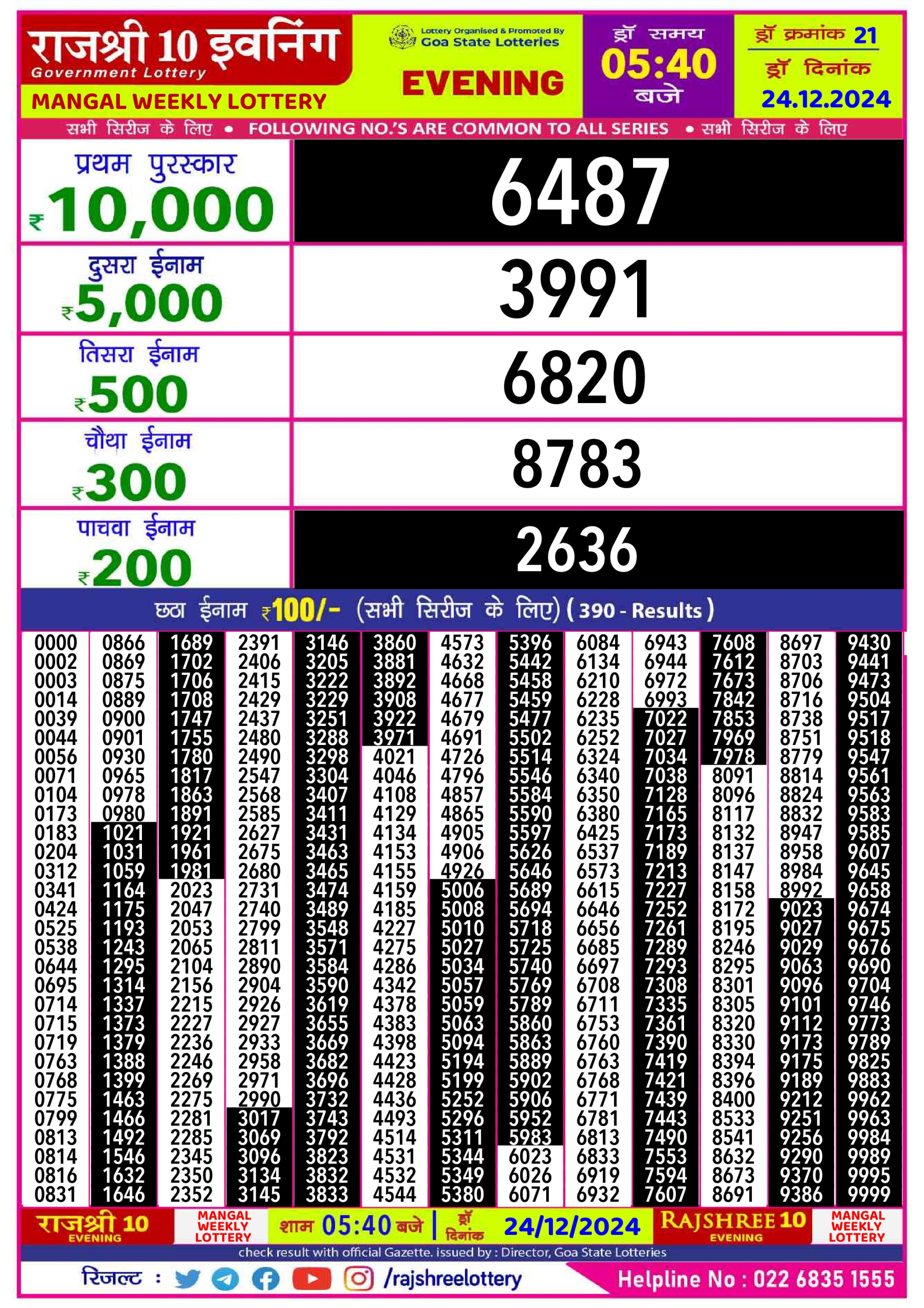 Rajshree 1000 Monthly Lottery Result 6.30 PM 24.12.2024