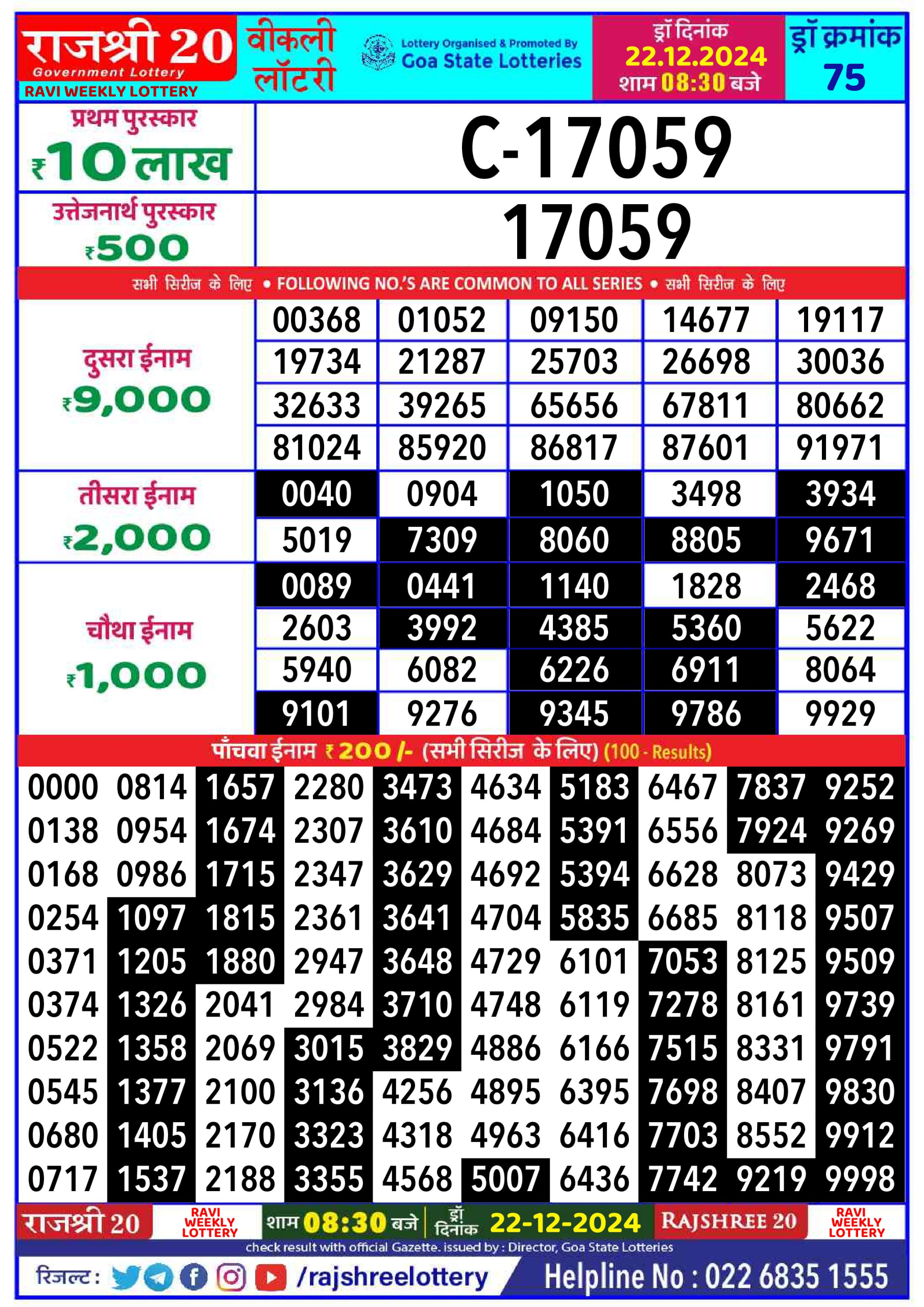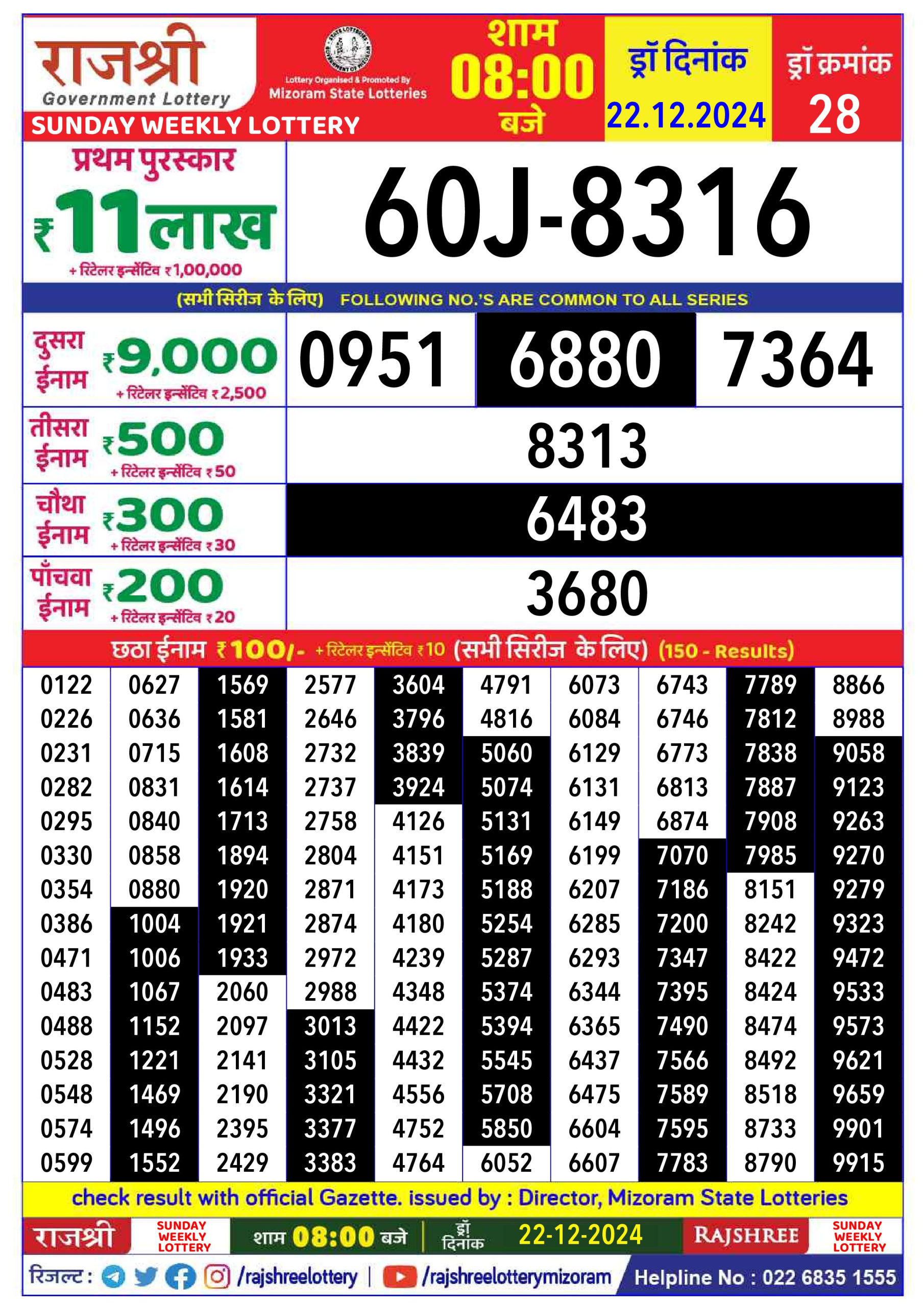Rajshree Weekly Lottery 8PM Result 22.12.24