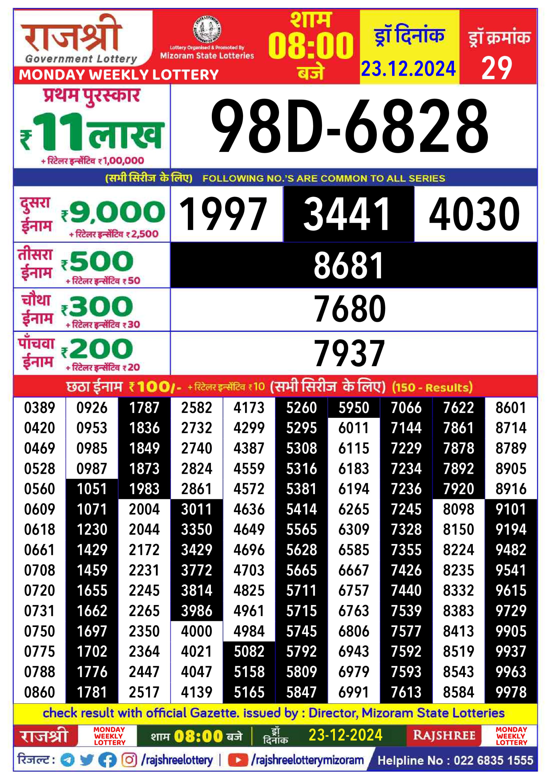 Rajshree Weekly Lottery 8PM Result 23.12.24