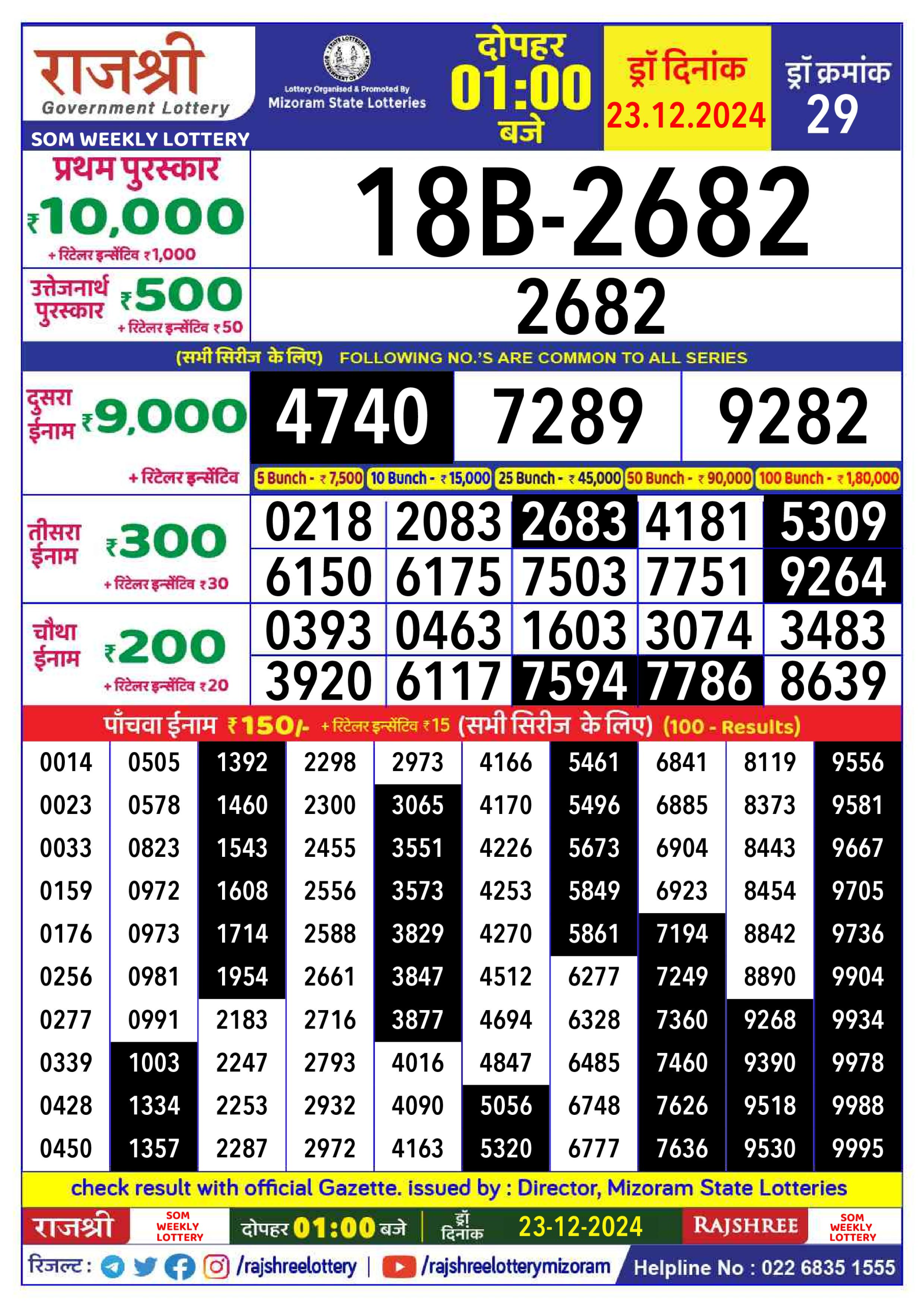 Rajshree som  Weekly Lottery 1PM Result 23.12.24