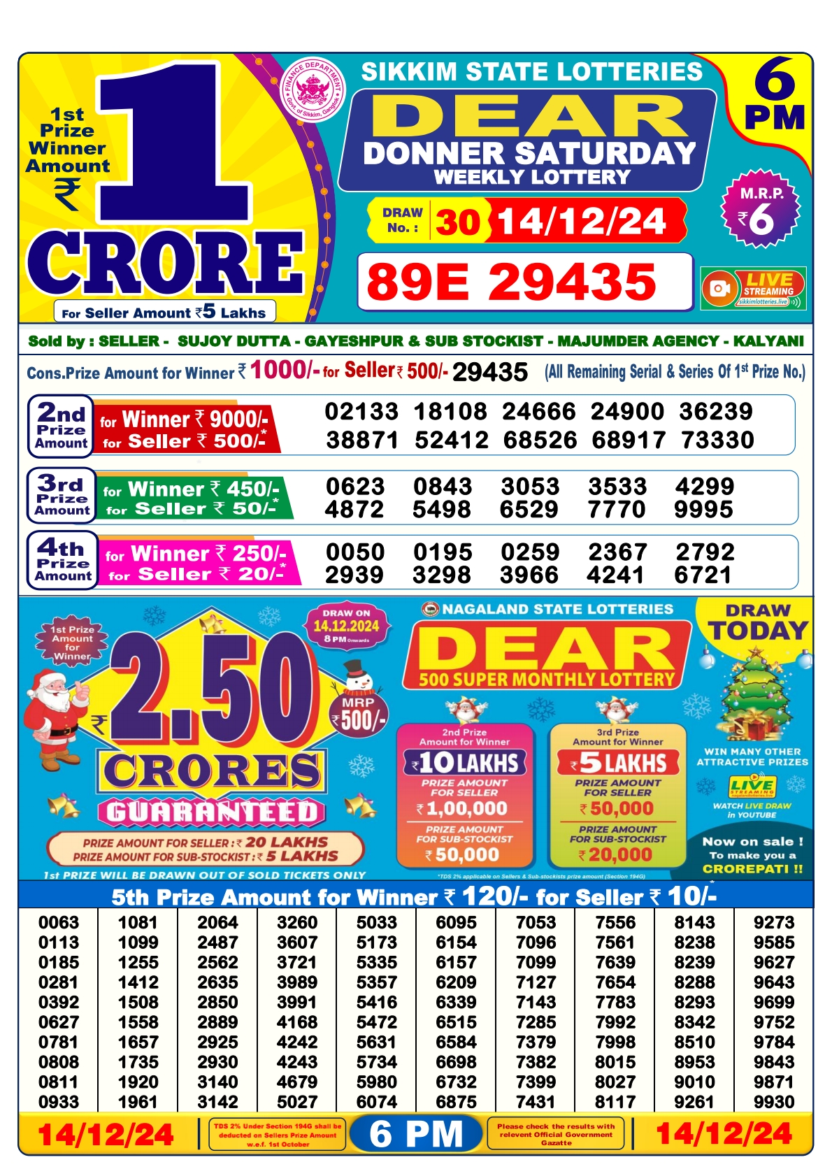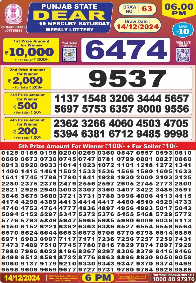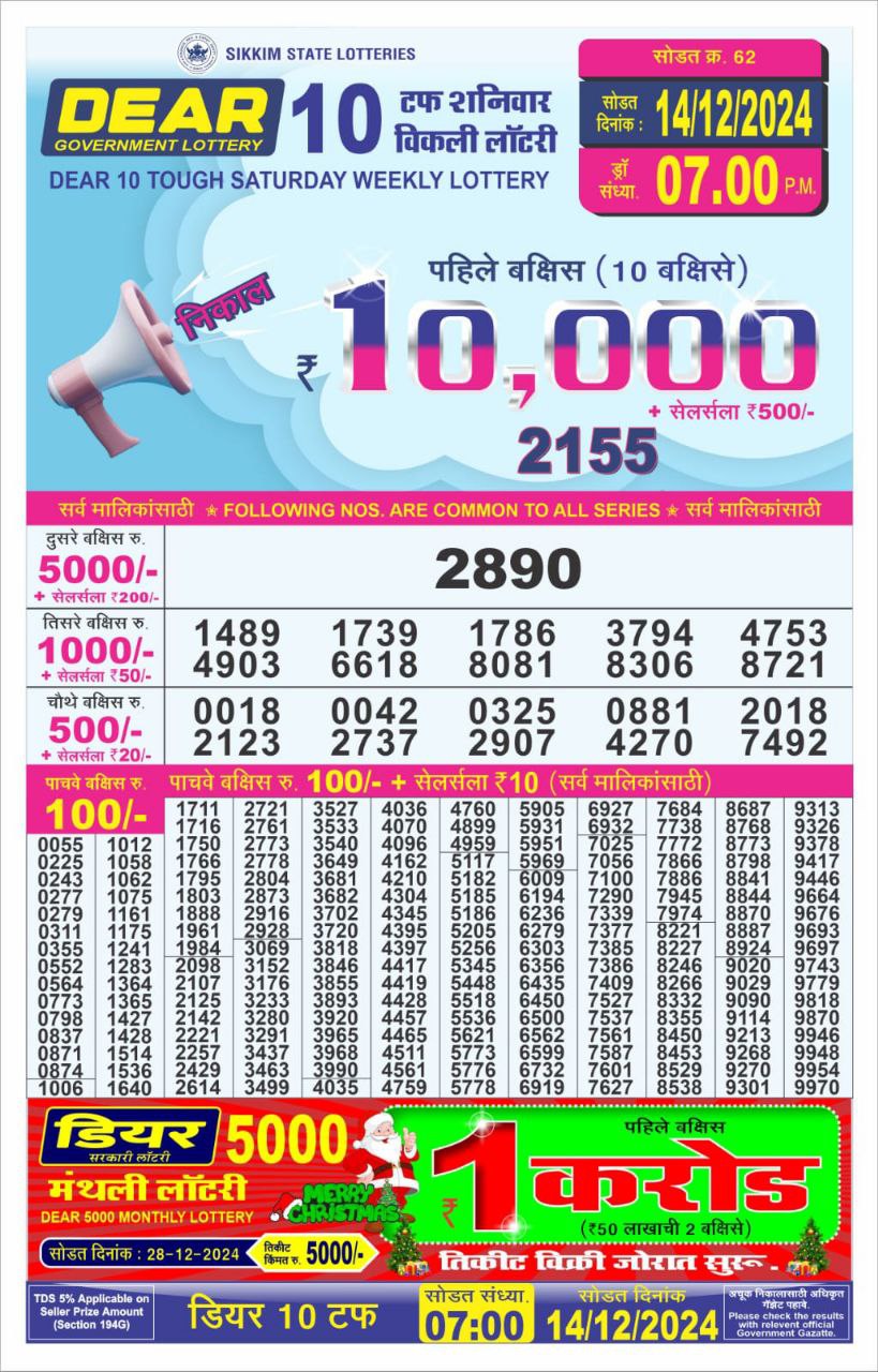 Dear 10 yellow lottery 1.30PM Result 14.12.24