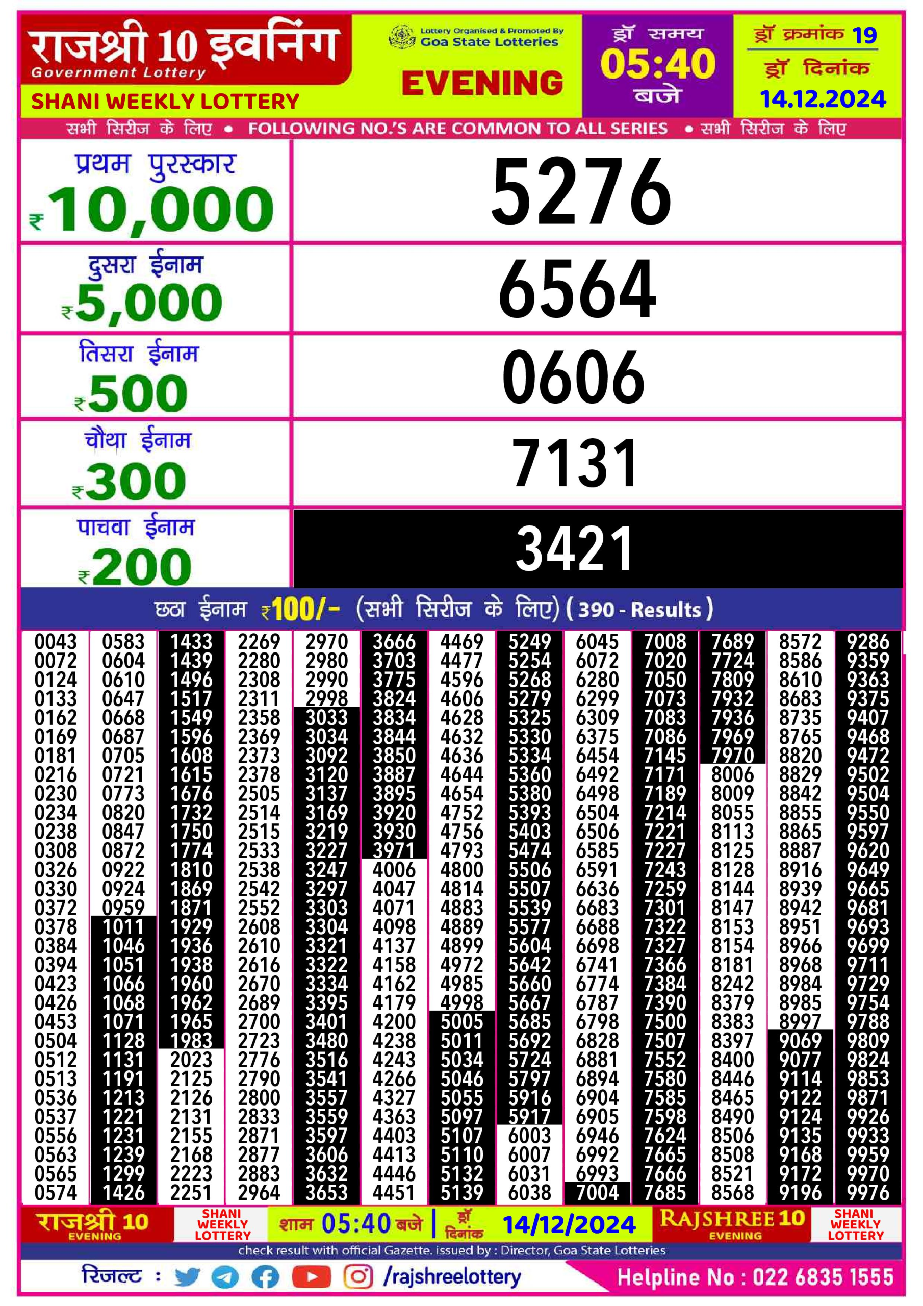Rajshree 10 evening Saturday 5:40pm result 14.12.24