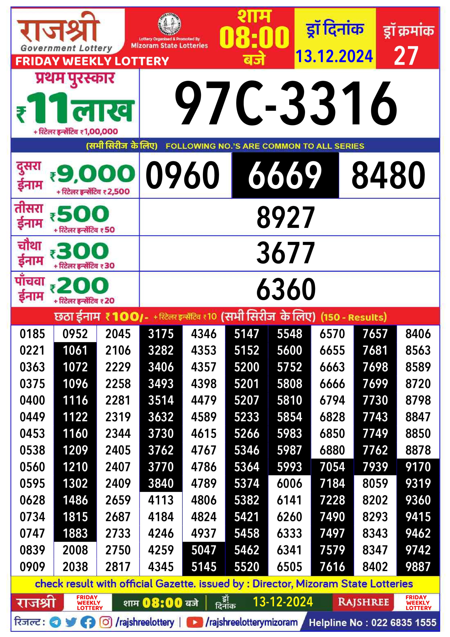 Rajshree Weekly Lottery 8PM Result 13.12.24