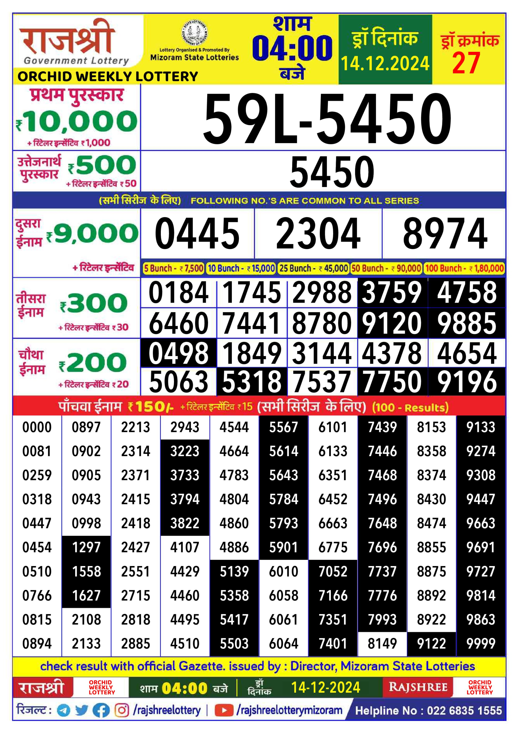 Rajshree orchid Saturday Weekly Lottery 4PM Result 14.12.24