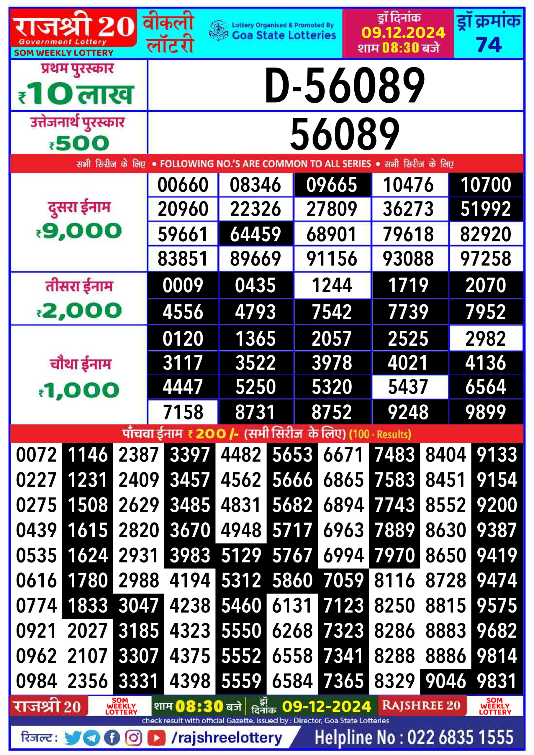Rajshree som  Weekly Lottery 1PM Result 9.12.24