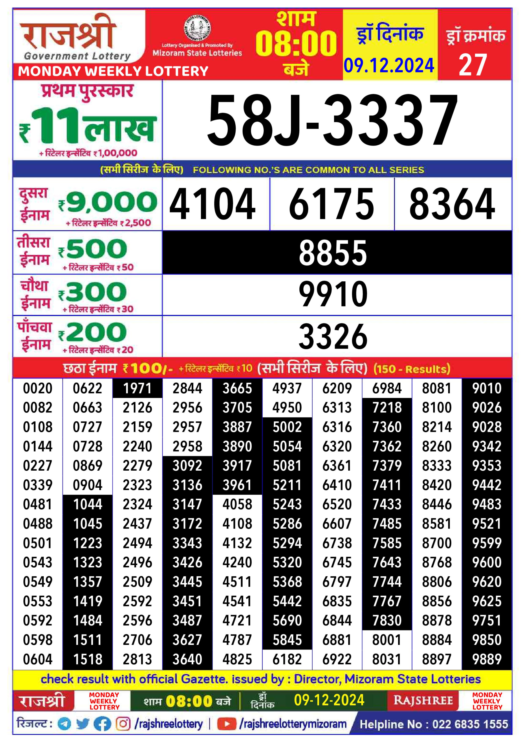 Rajshree Weekly Lottery 8PM Result 9.12.24