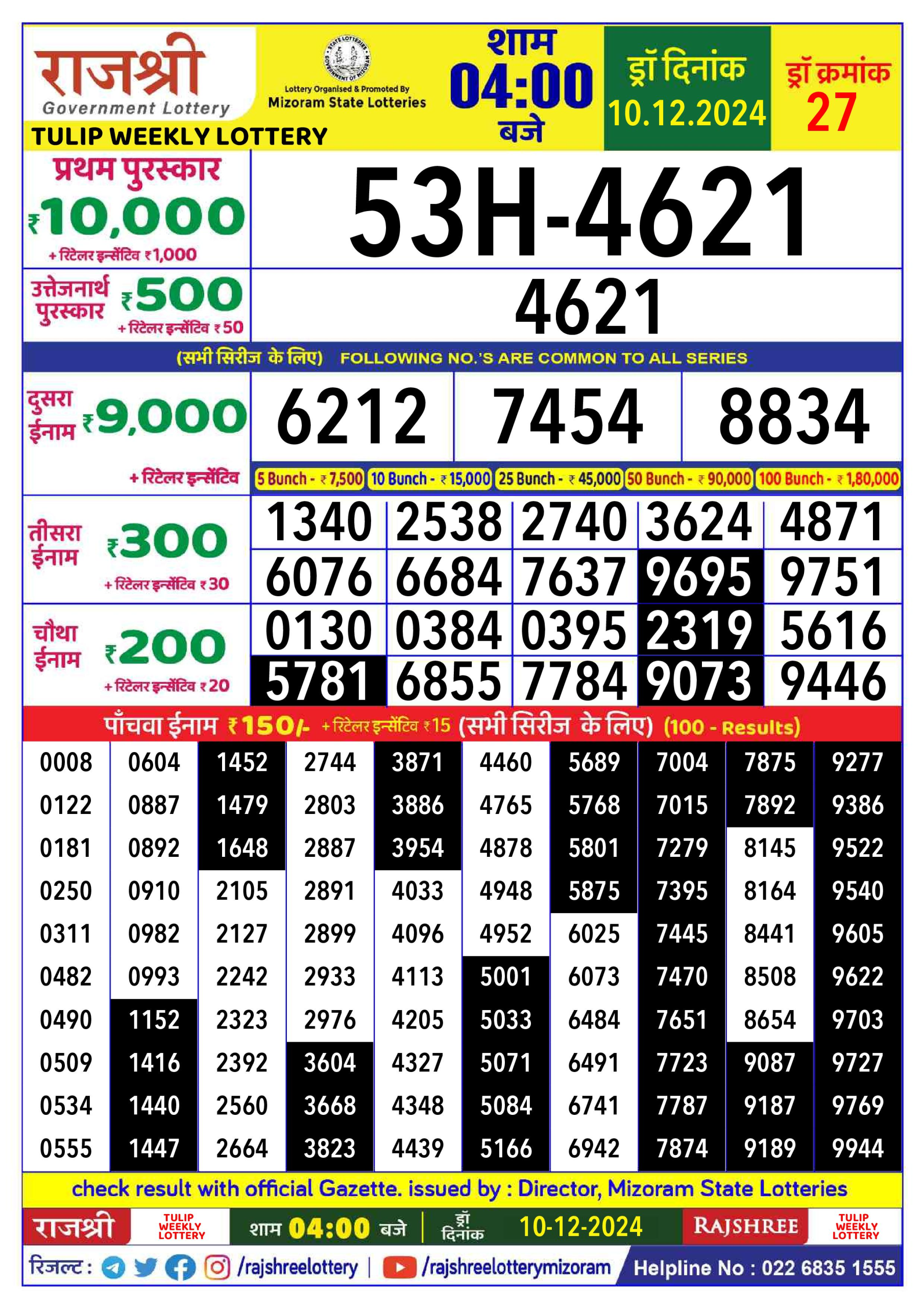 Rajshree tulip Tuesday Weekly Lottery 4PM Result 10.12.24