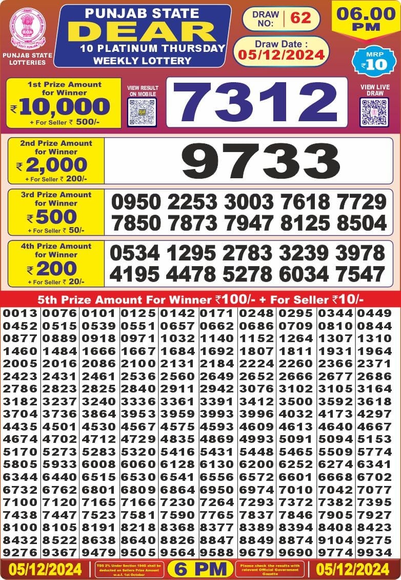 Punjab state dear 10 6pm lottery result 5.12.24