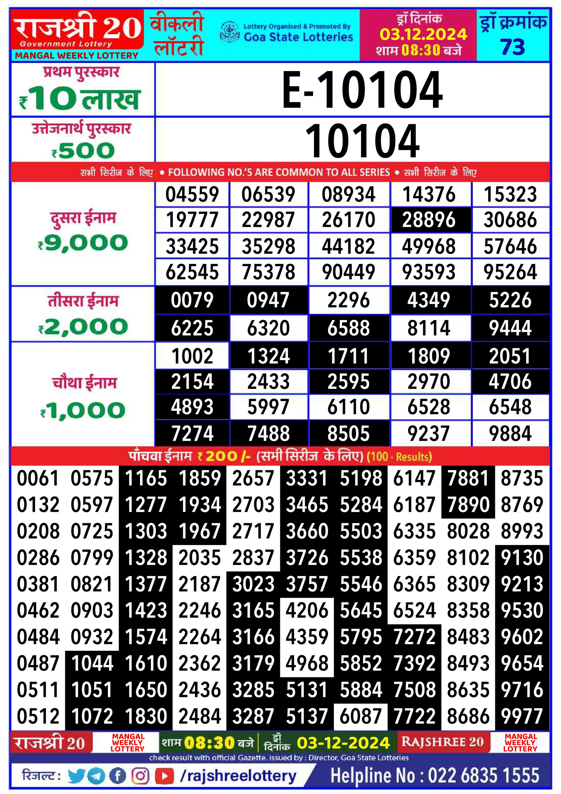 Rajshree mangal  Weekly Lottery 1PM Result 3.12.24