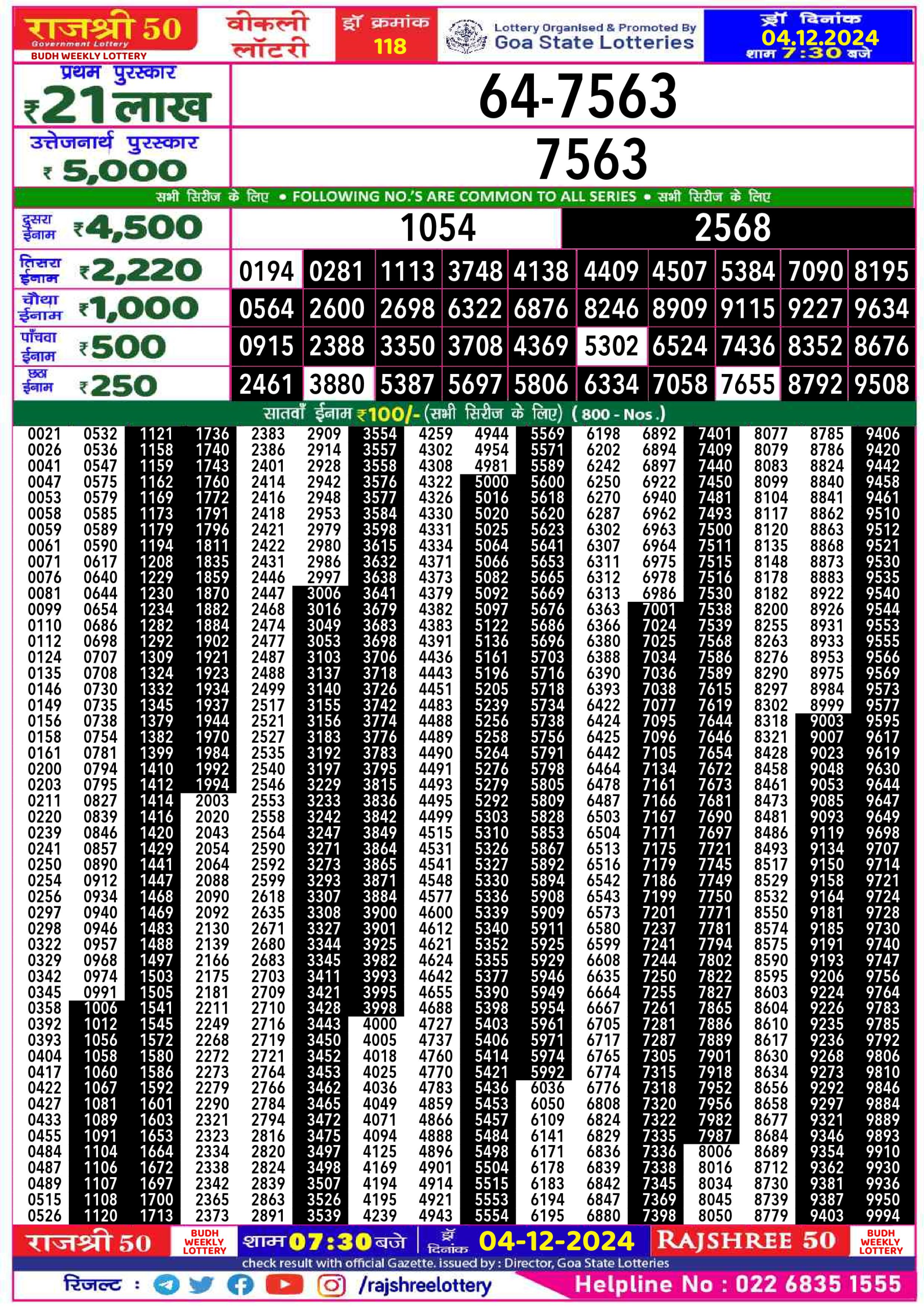 Rajshree 50 Lottery 7:30PM Result 4.12.24