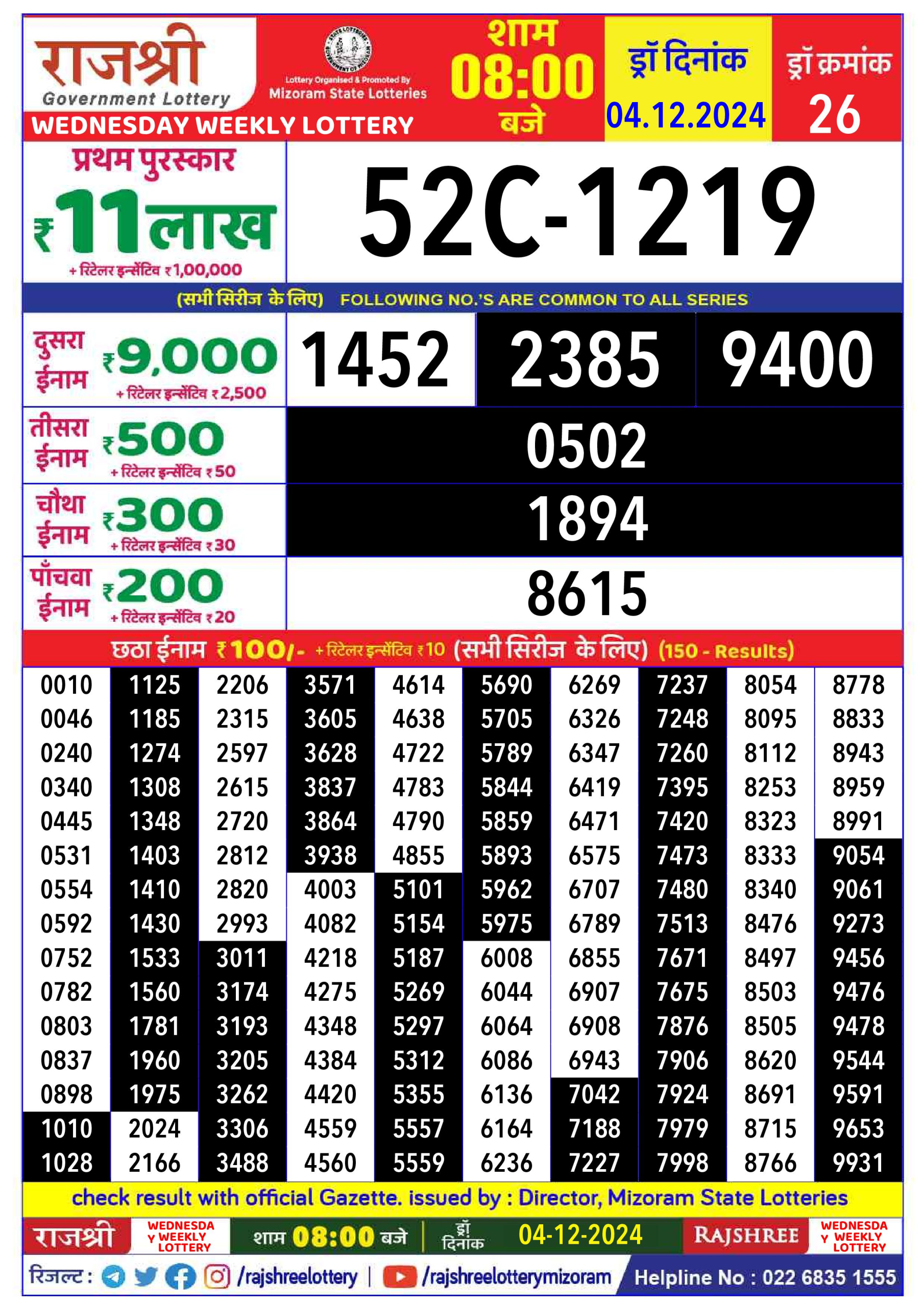 Rajshree Weekly Lottery 8PM Result 4.12.24