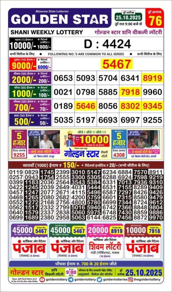 Golden Star Weekly Lottery Result 9pm 25.10.2025
