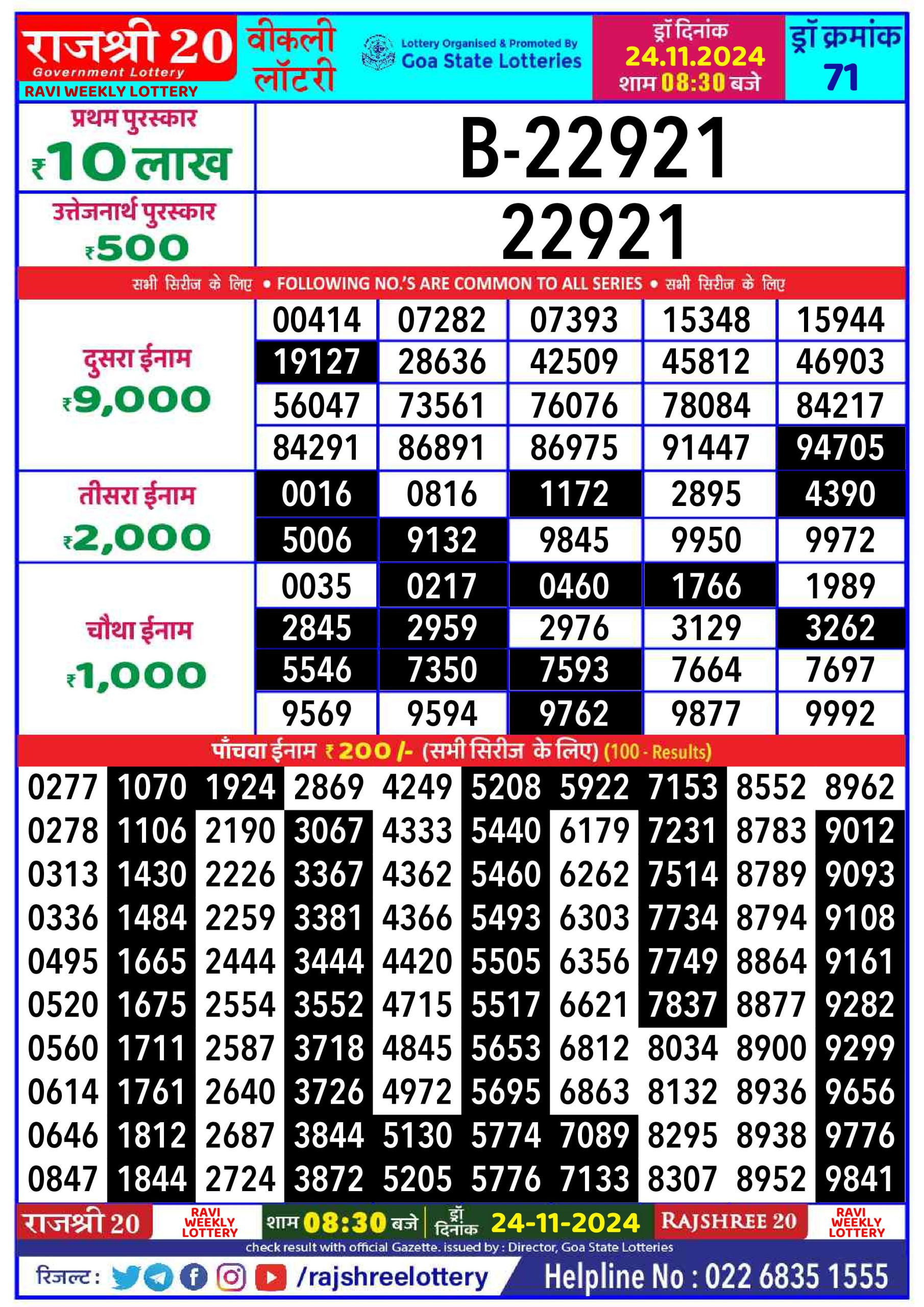 Rajshree 20  Lottery 8:30PM Result 24.11.24
