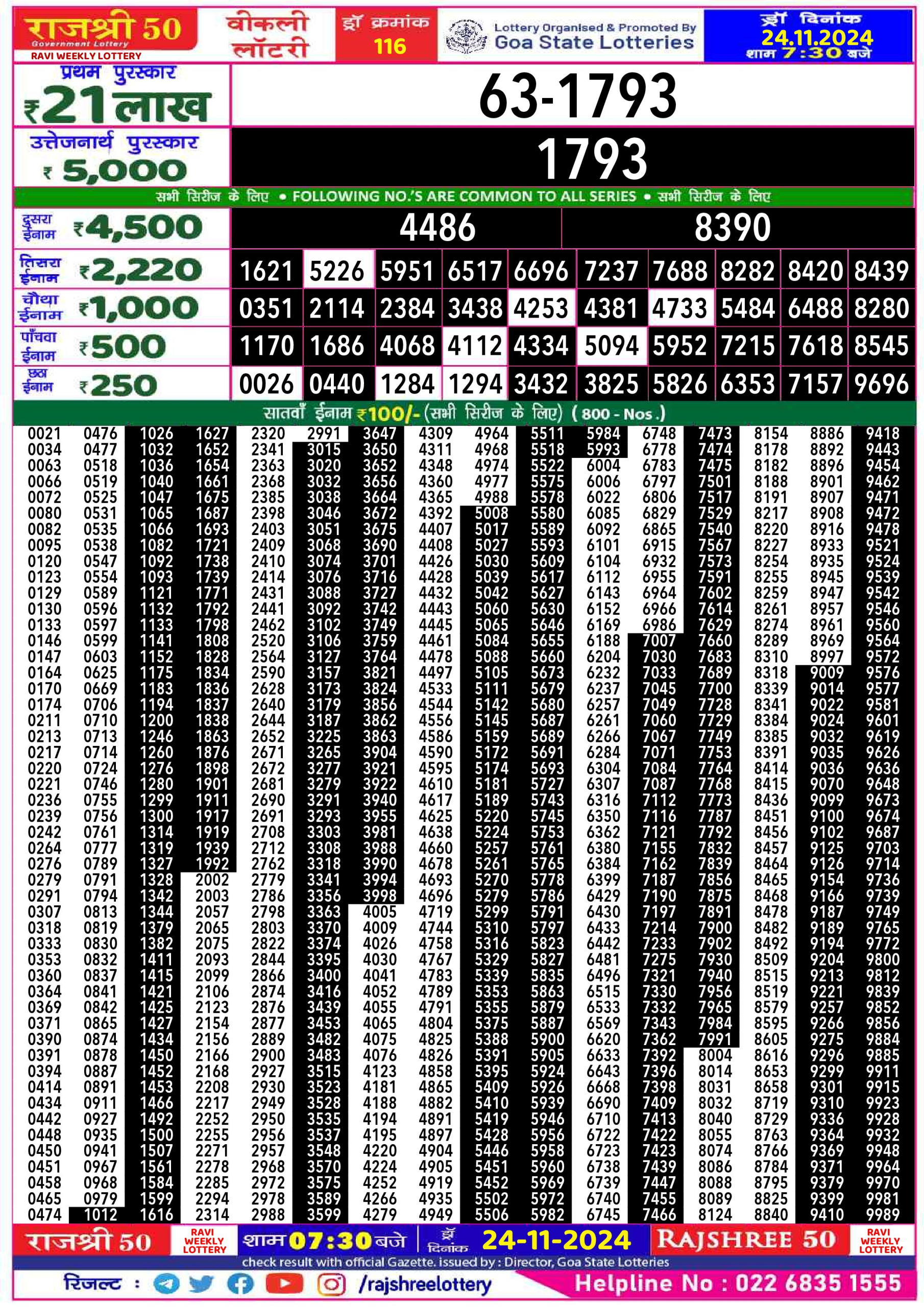 Rajshree 50  Lottery 7:30PM Result 24.11.24