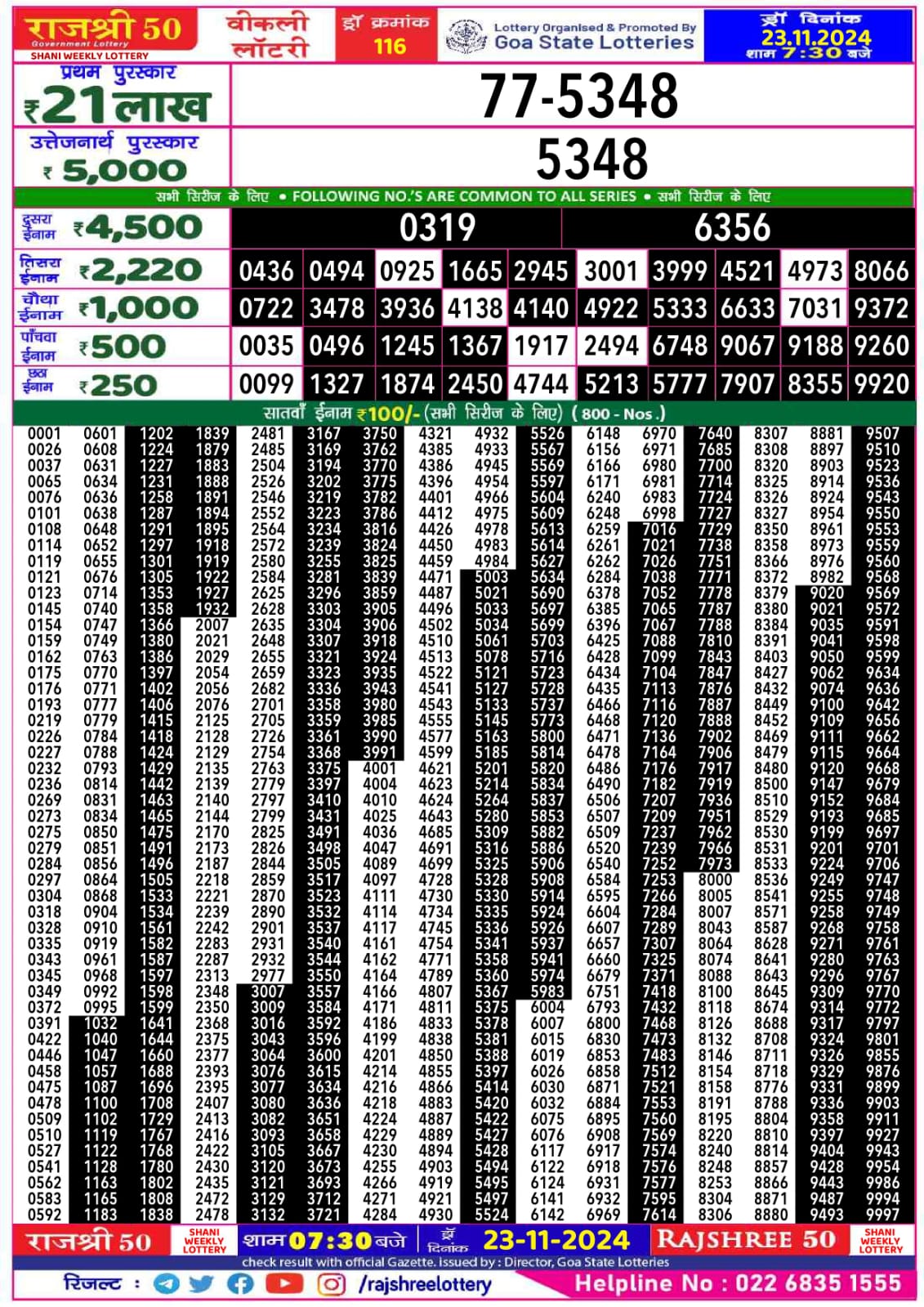 Rajshree 50  Lottery 7:30PM Result 23.11.24