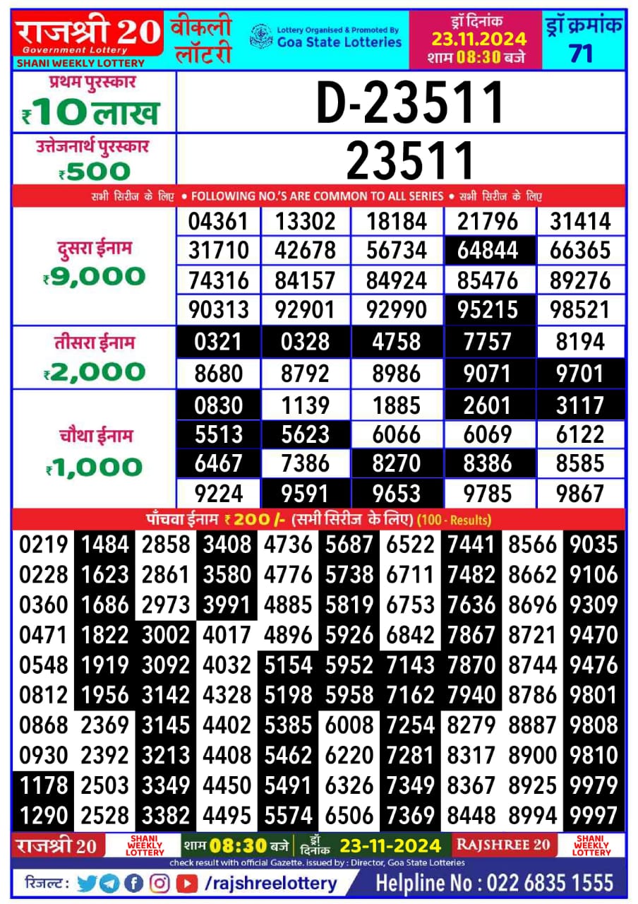 Rajshree 20  Lottery 8:30PM Result 23.11.24