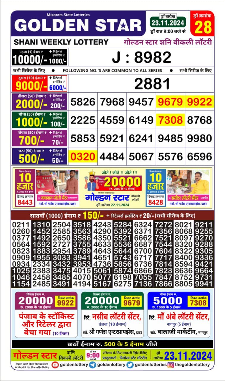 Golden king  weekly lottery 4.30pm result 23.11.24