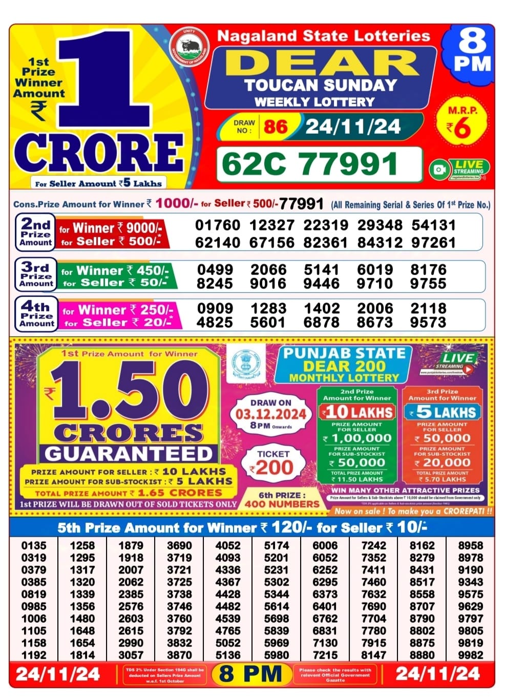 Dear toucan Weekly Lottery 8PM Result 24.11.24