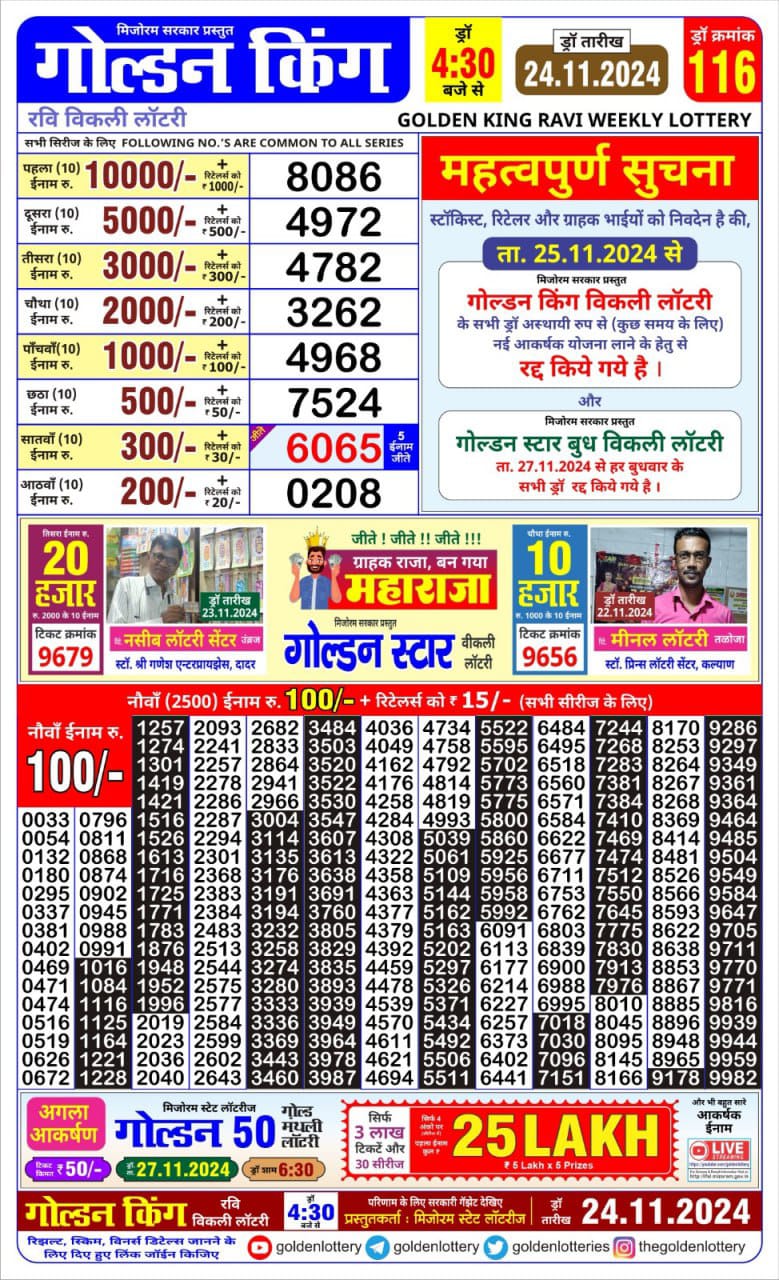 Golden king  weekly lottery 4.30pm result 24.11.24