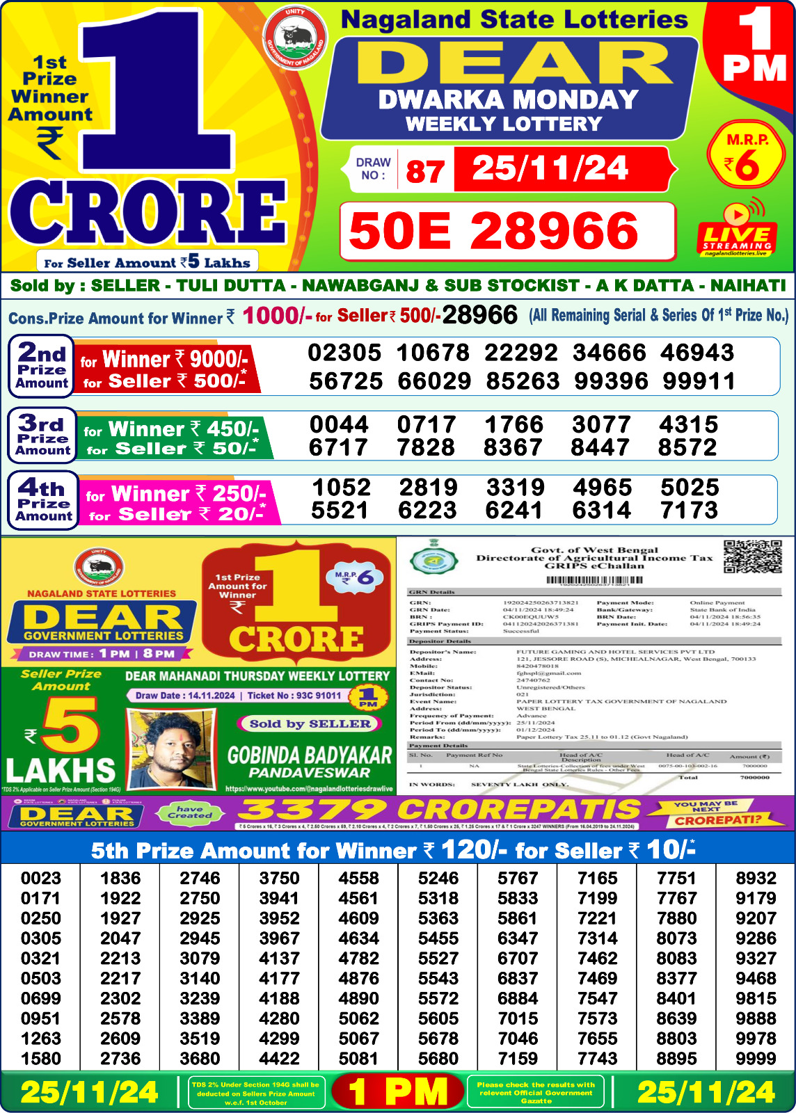 Dear dwarka monday Weekly 1pm result 25.11.24