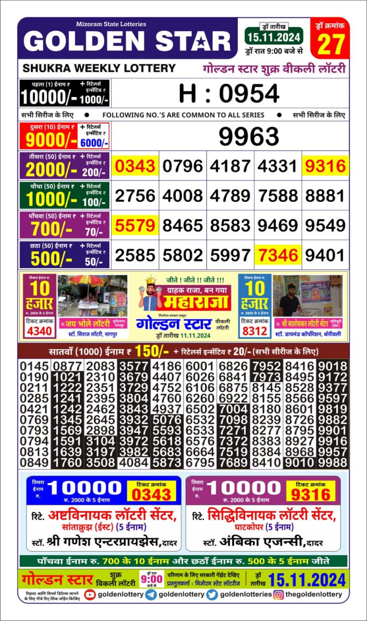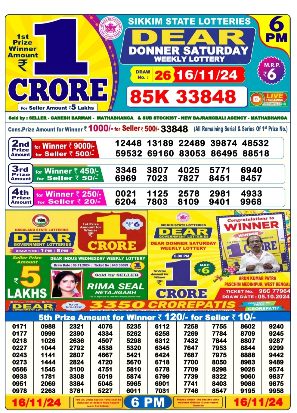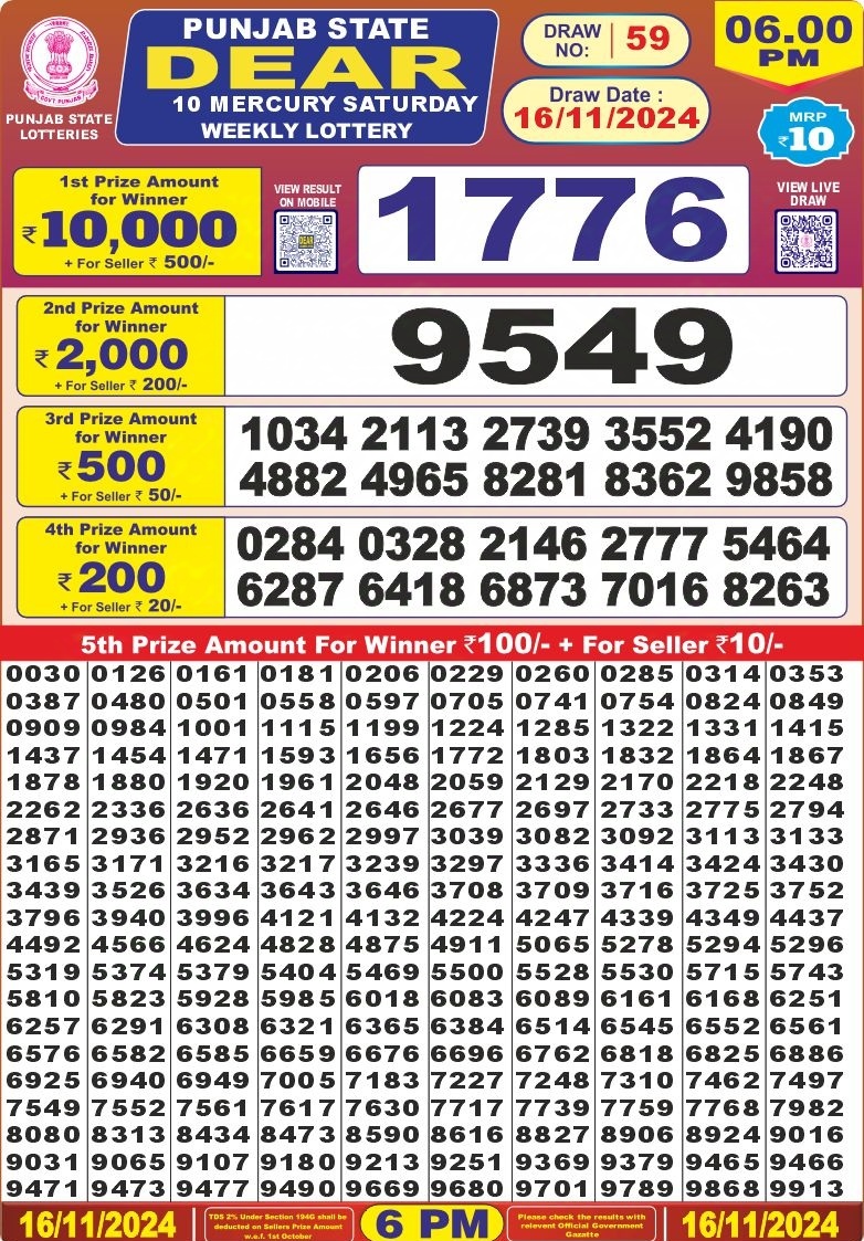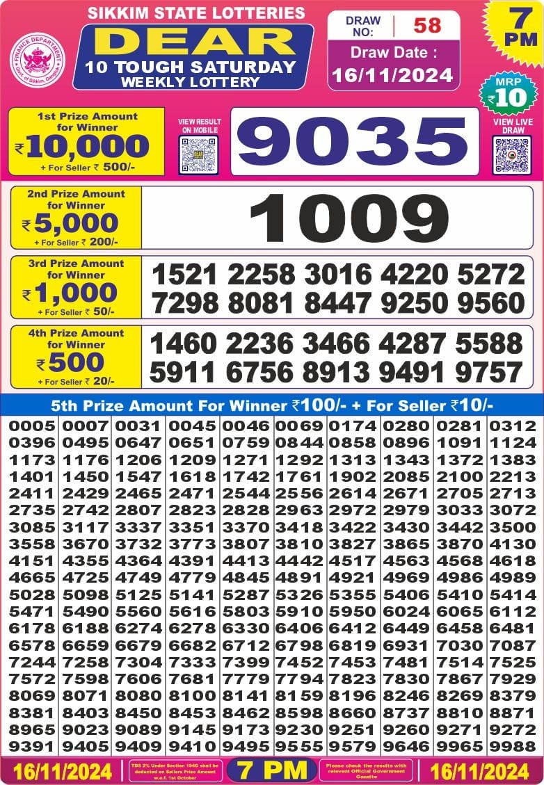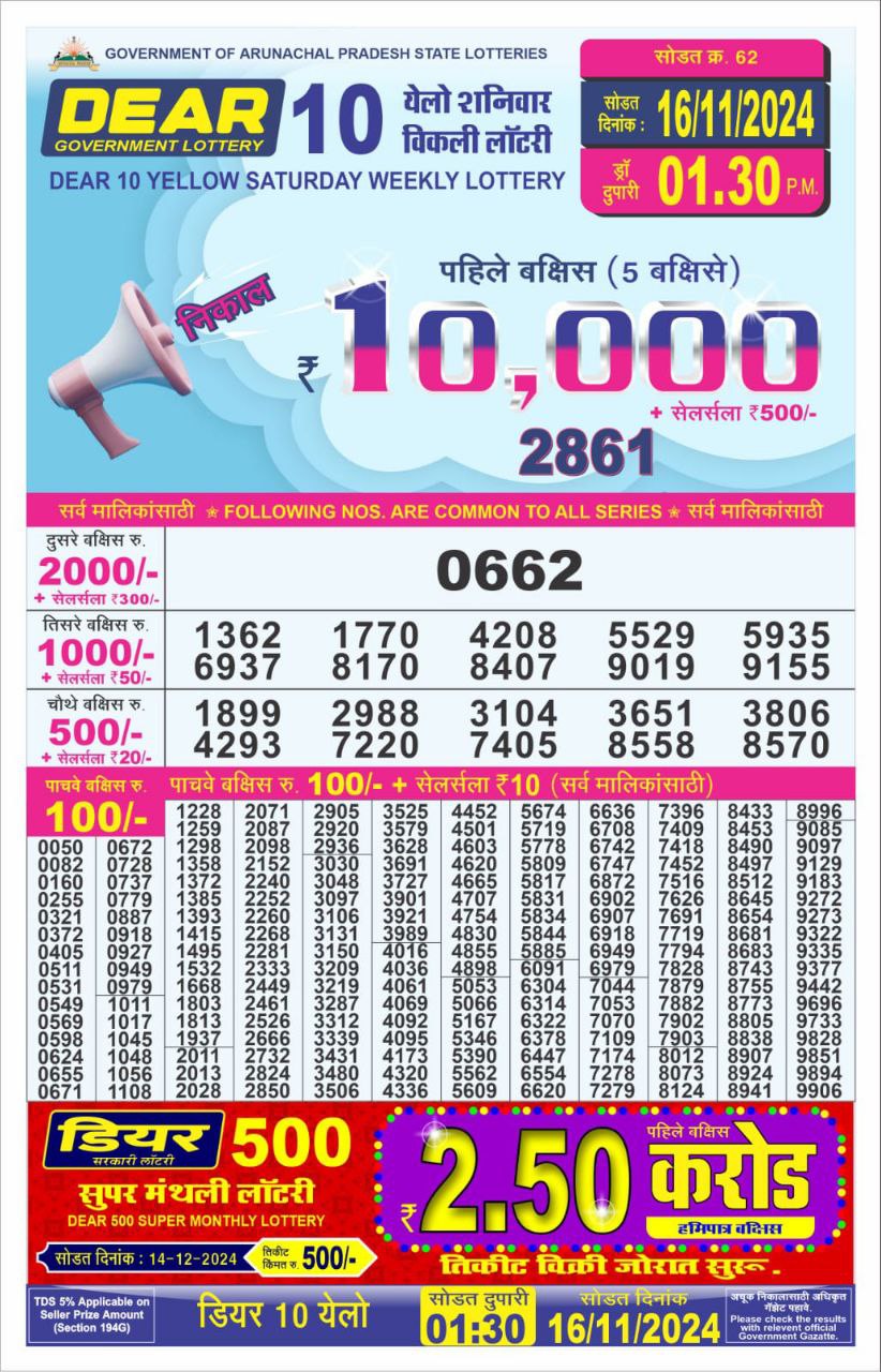 Dear 10 yellow lottery 1.30PM Result 16.11.24