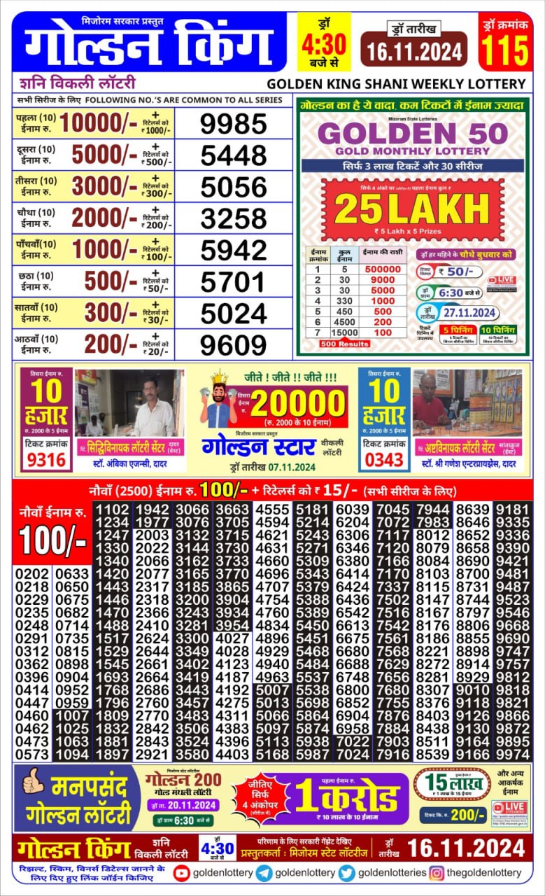 Golden king  weekly lottery 4.30pm result 16.11.24
