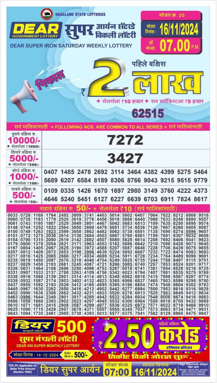 Dear 1000 Monthly Lottery Result Today 16.11.2024