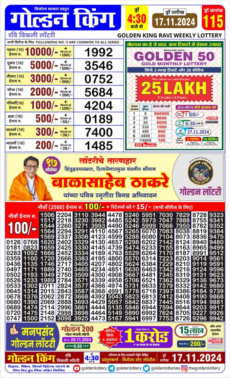 Golden king  weekly lottery 4.30pm result 17.11.24
