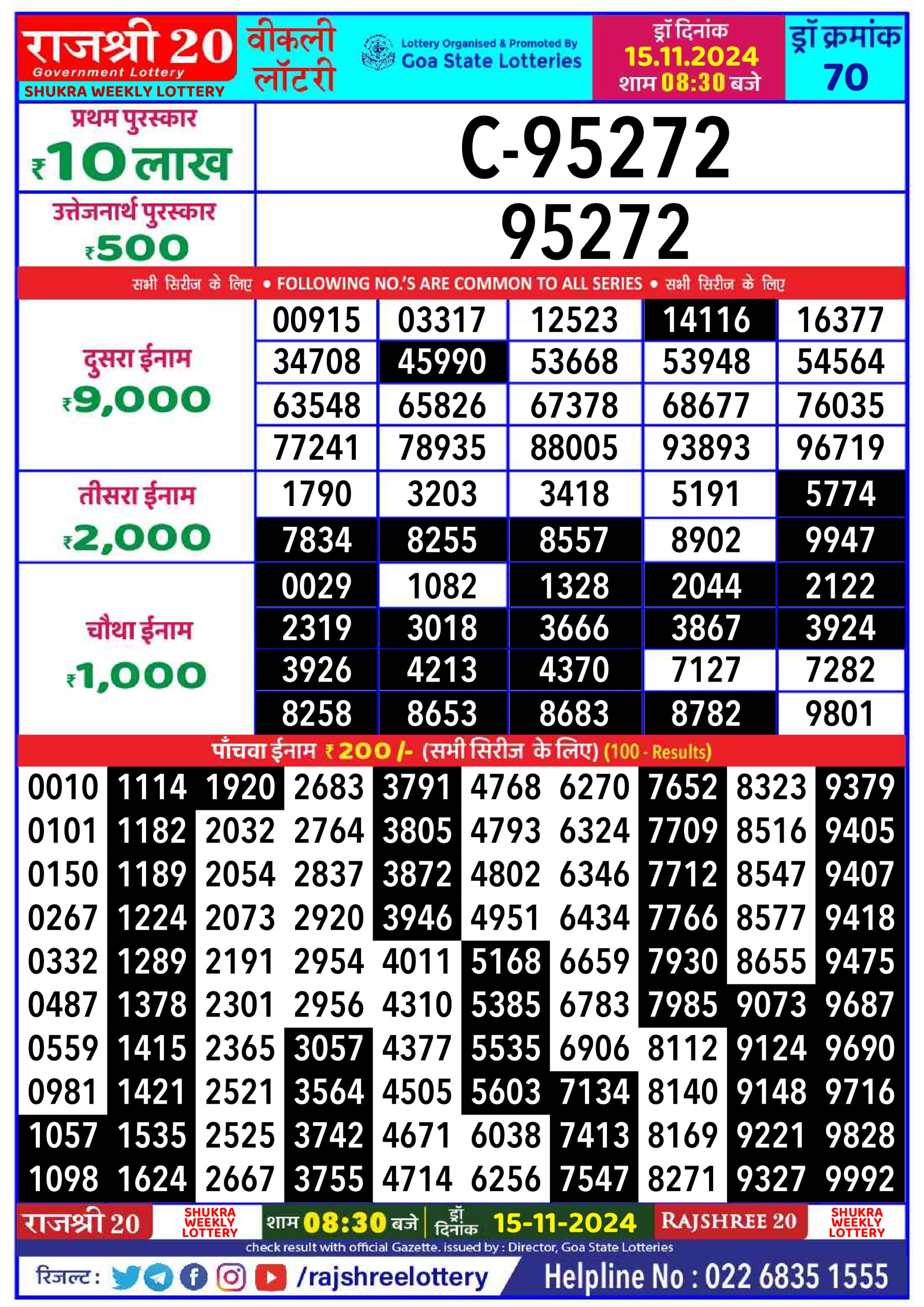 Rajshree 20  Lottery 8:30PM Result 15.11.24