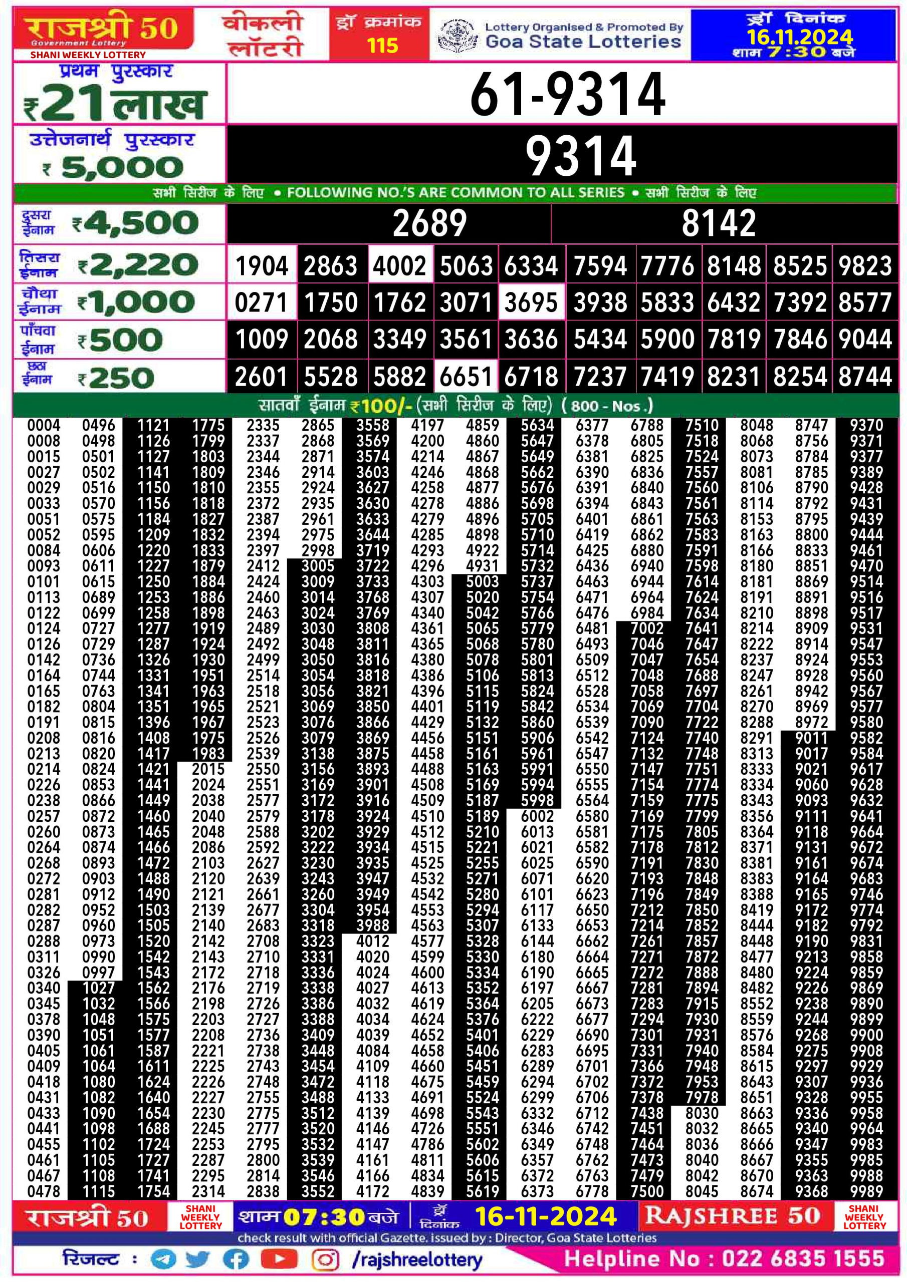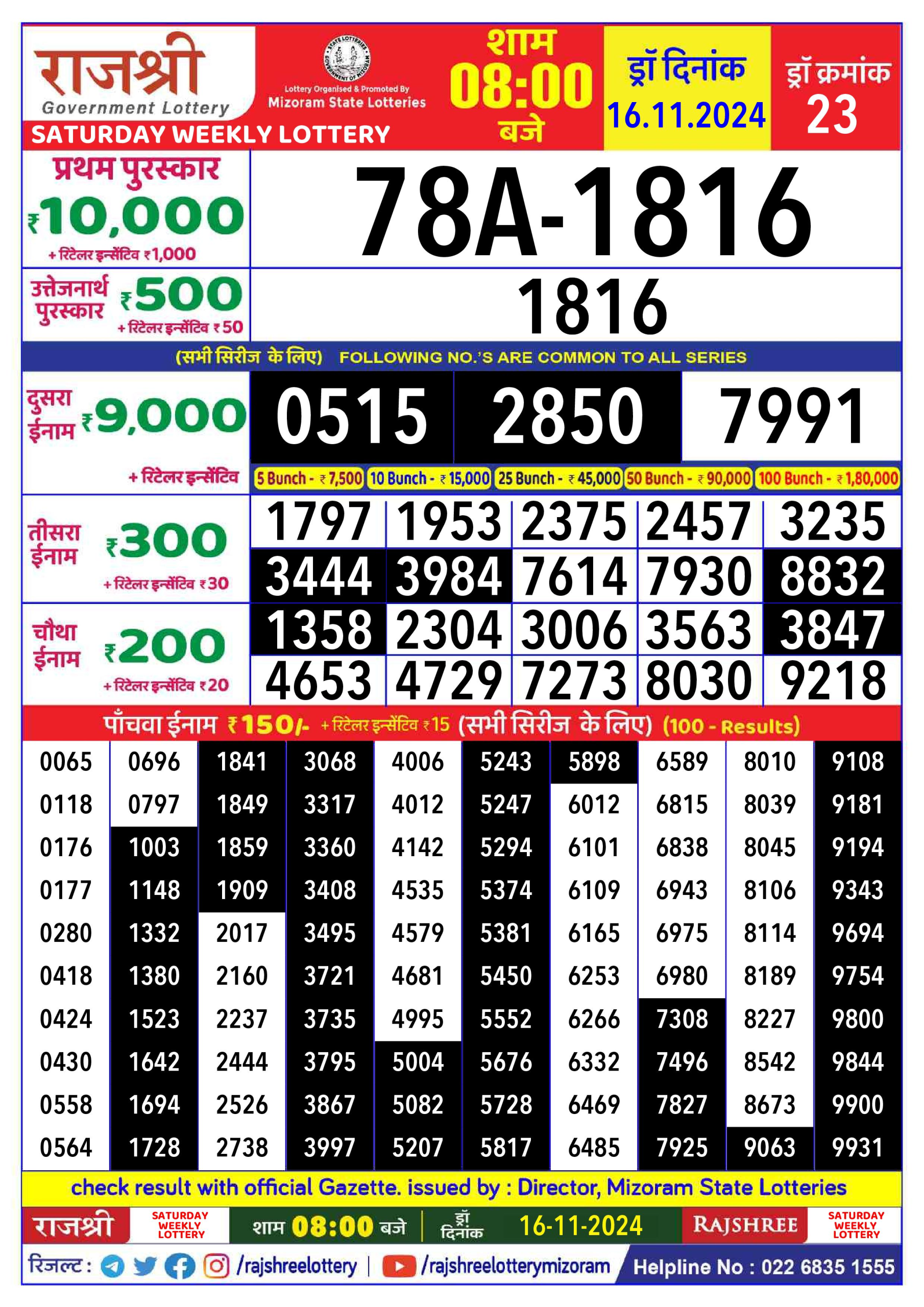Rajshree 50  Lottery 7:30PM Result 16.11.24