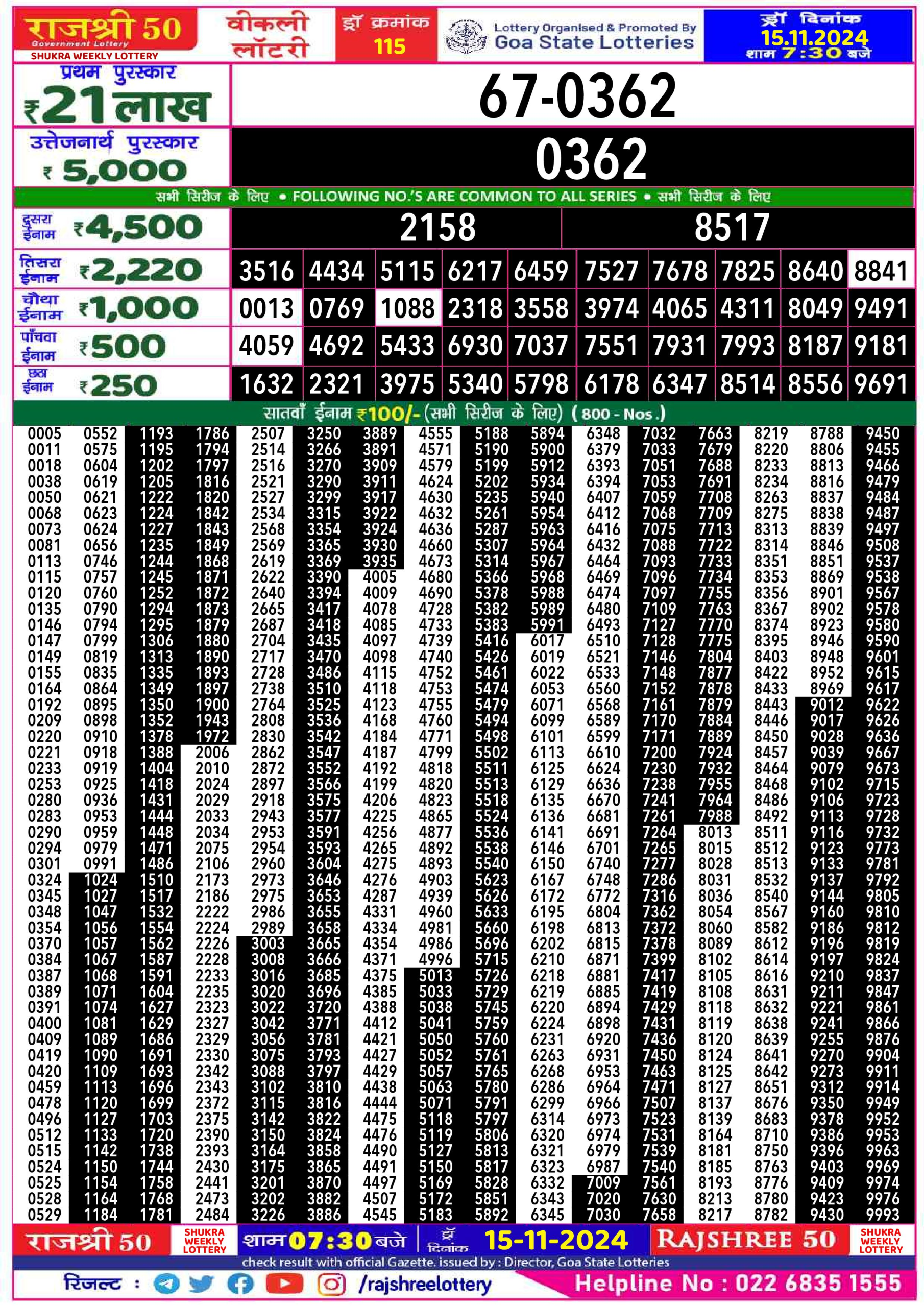 Rajshree 50  Lottery 7:30PM Result 15.11.24