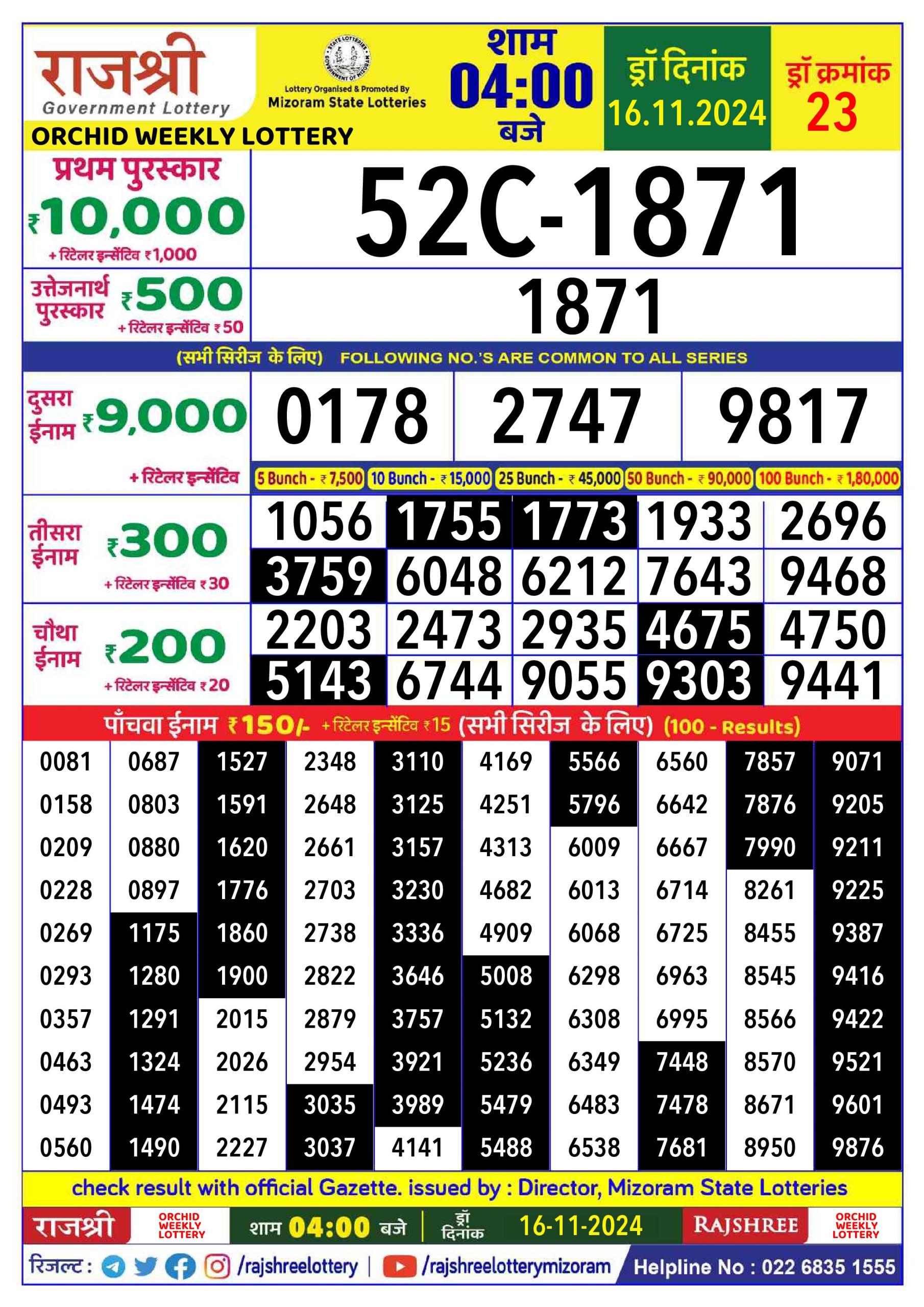 Rajshree orchid Saturday Weekly Lottery 4PM Result 16.11.24
