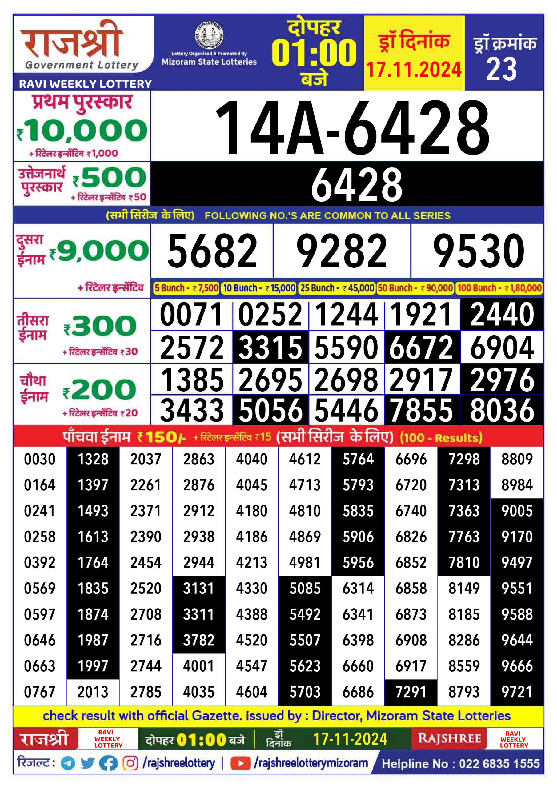 Rajshree ravi  Weekly Lottery 1PM Result 17.11.24
