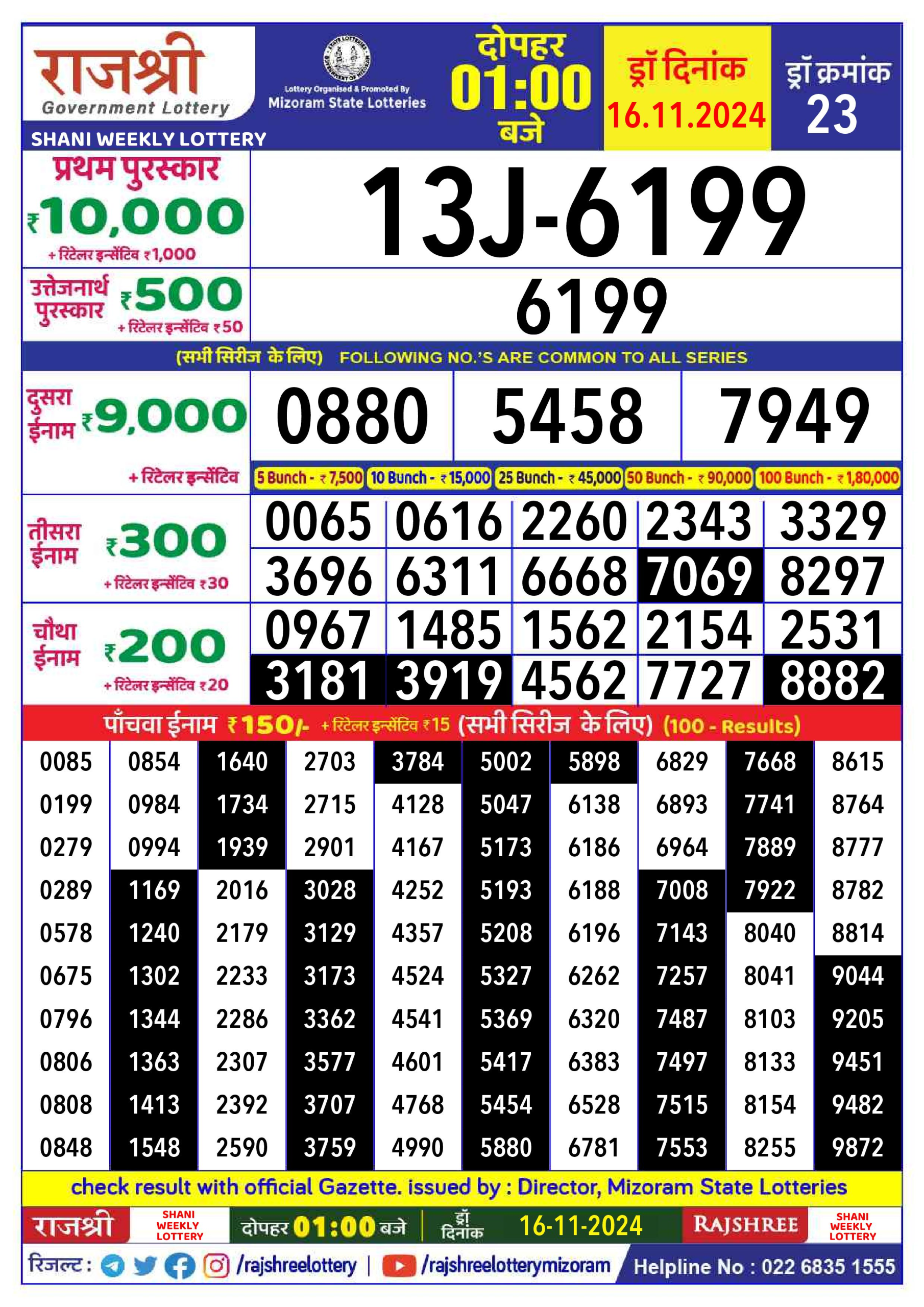 Rajshree shani  Weekly Lottery 1PM Result 16.11.24