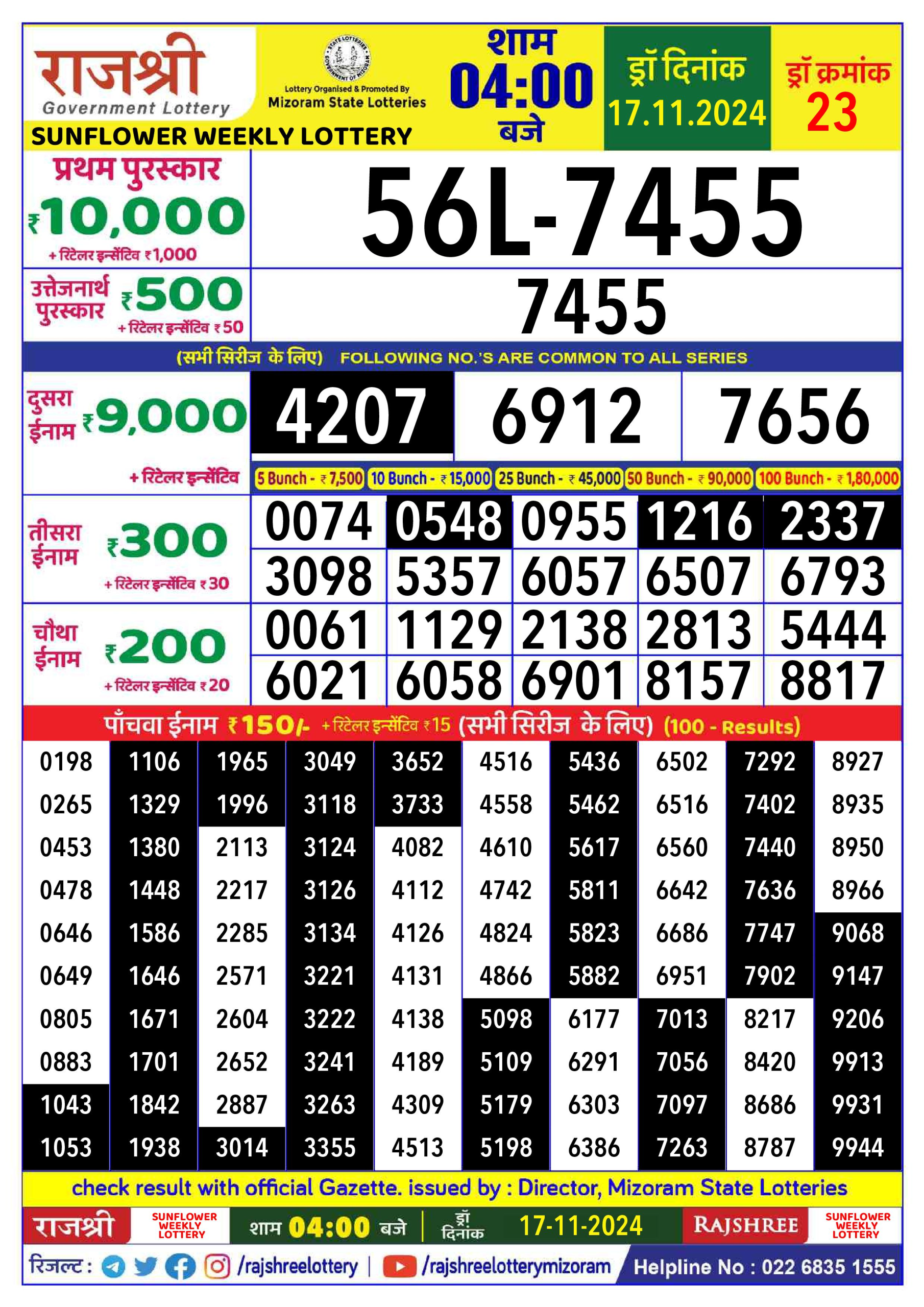 Rajshree sunflower sunday Weekly Lottery 4PM Result 17.11.24