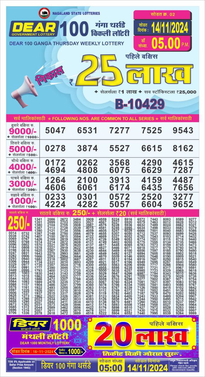Dear 100 Ganga Thursday  Lottery 5pm Result  14.11.24