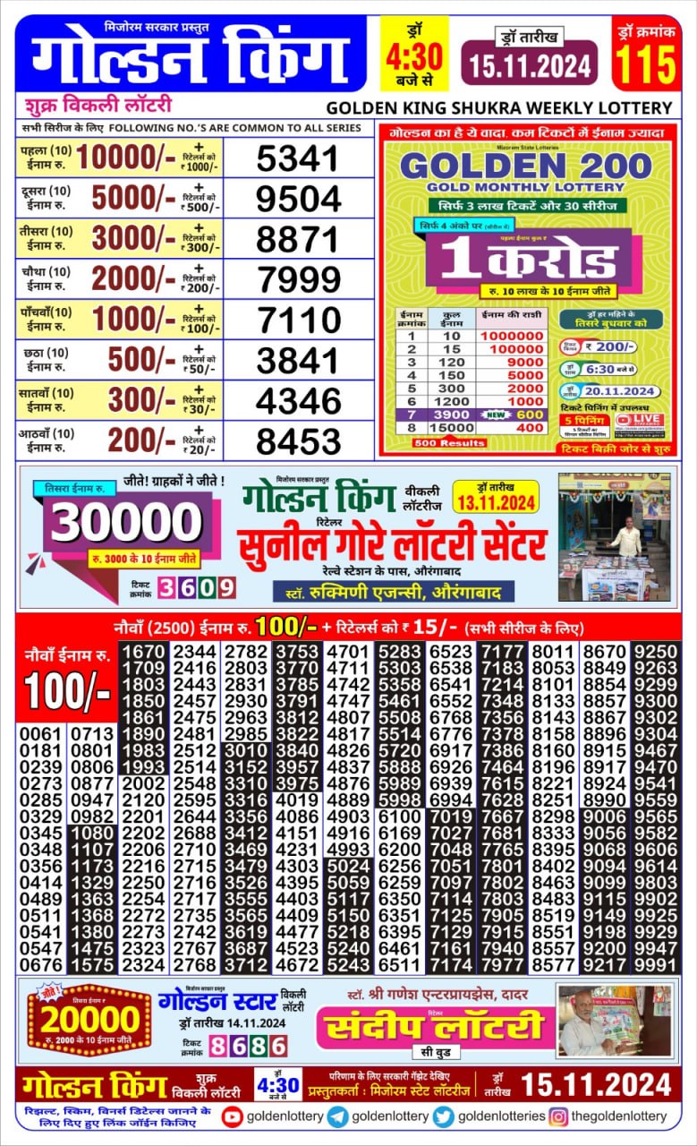 Golden king  weekly lottery 4.30pm result 15.11.24